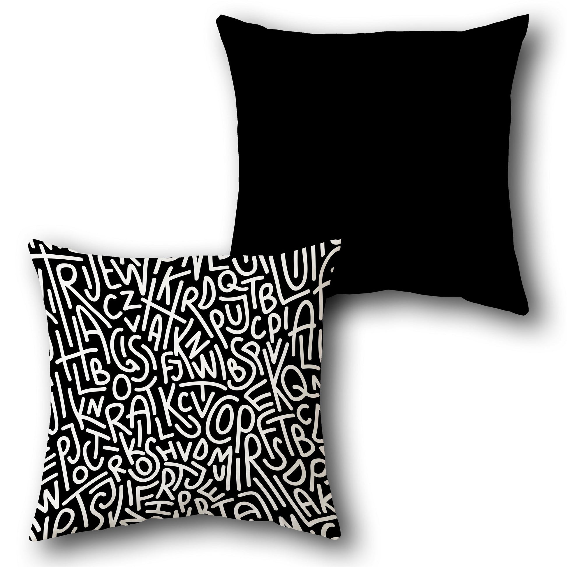 This single-sided cushion showcases a bold abstract typography pattern on the front, featuring overlapping black letters on a cream base, creating a modern and artistic vibe. The back side is a solid deep black, providing a sleek contrast. Ideal for adding a contemporary touch to your home decor.