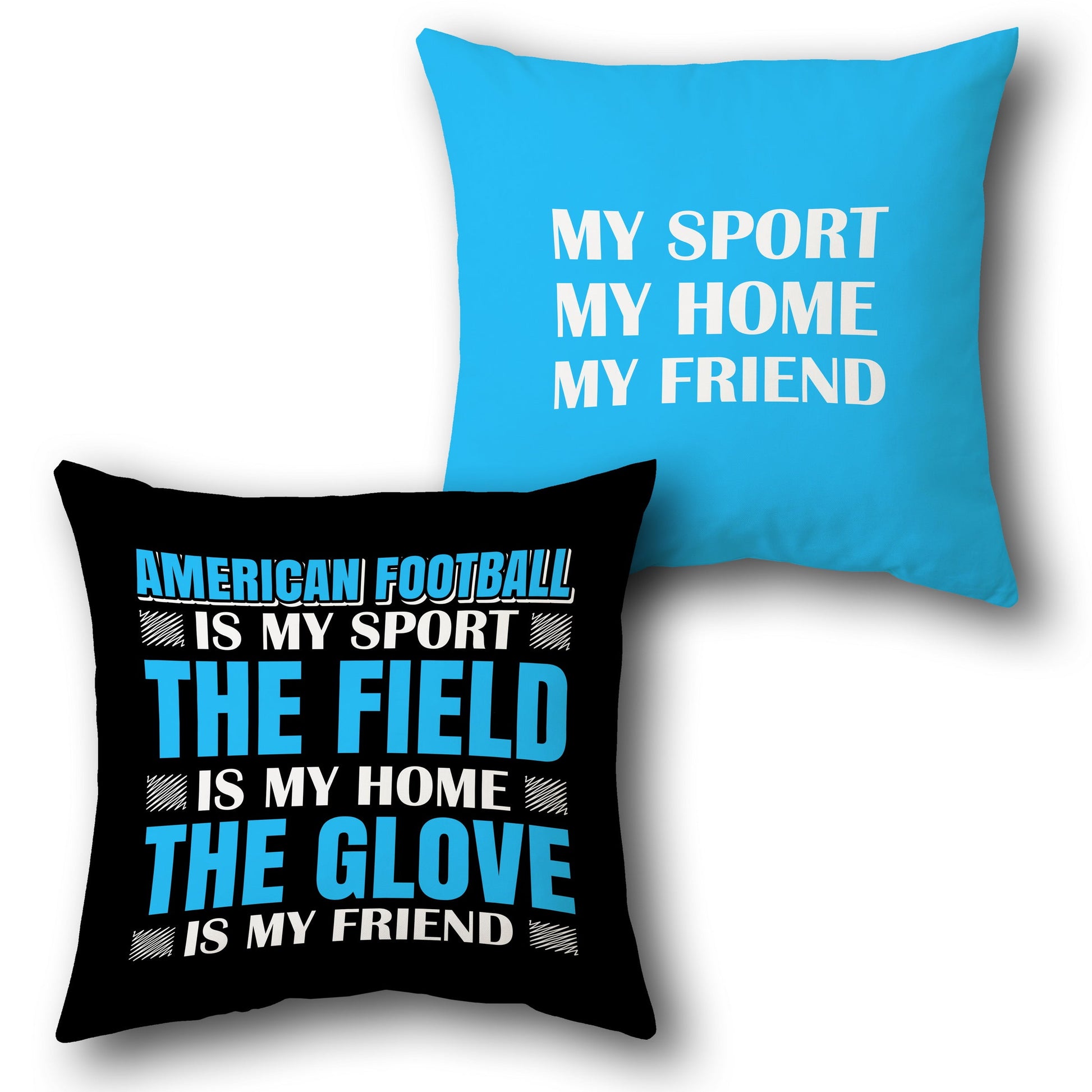 Celebrate your passion for football with this bold and stylish throw Cushion. The front side features a striking motivational quote in white and bright sky blue on a black base: “AMERICAN FOOTBALL IS MY SPORT. THE FIELD IS MY HOME. THE GLOVE IS MY FRIEND.”