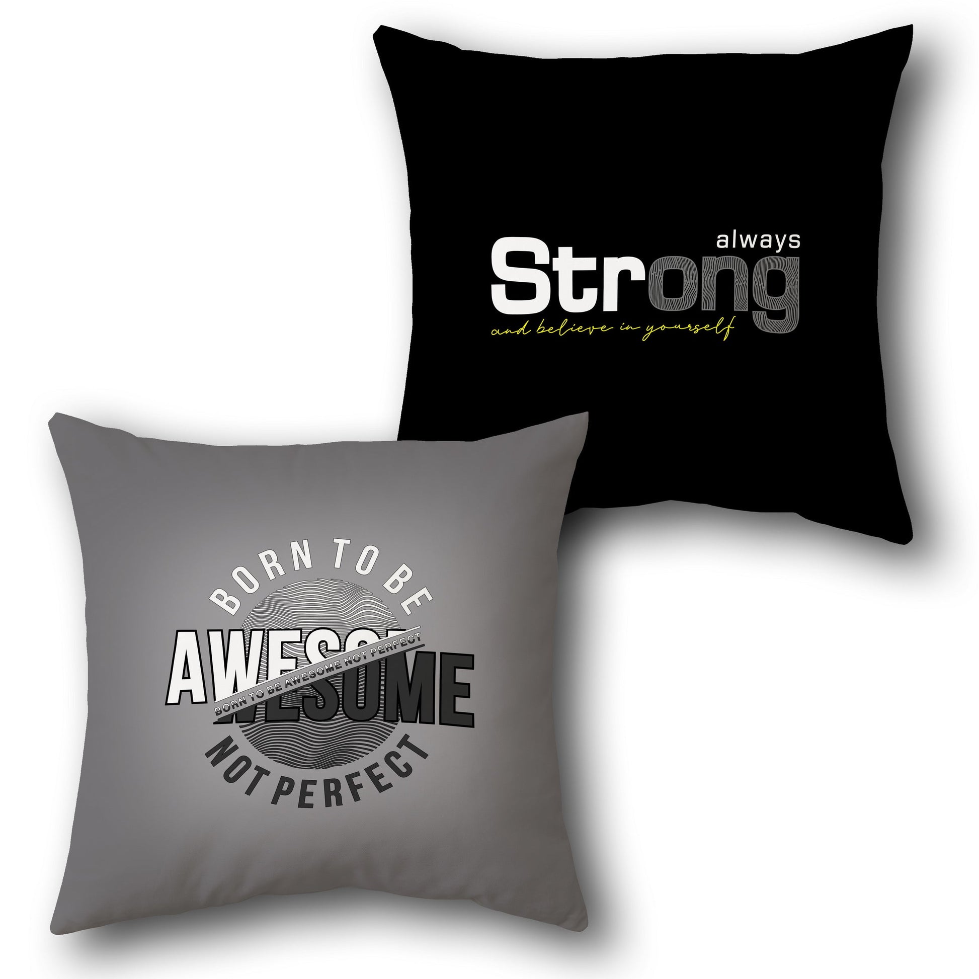 This cushion features a motivational dual-sided design. The front side has a gray base (desi sunehri) with white and black text that reads "BORN TO BE AWESOME NOT PERFECT." The back side has a black base (desi kaala) with white, gray, and mustard yellow text saying "ALWAYS STRONG AND BELIEVE IN YOURSELF." A great addition to inspire confidence and positivity in any space.