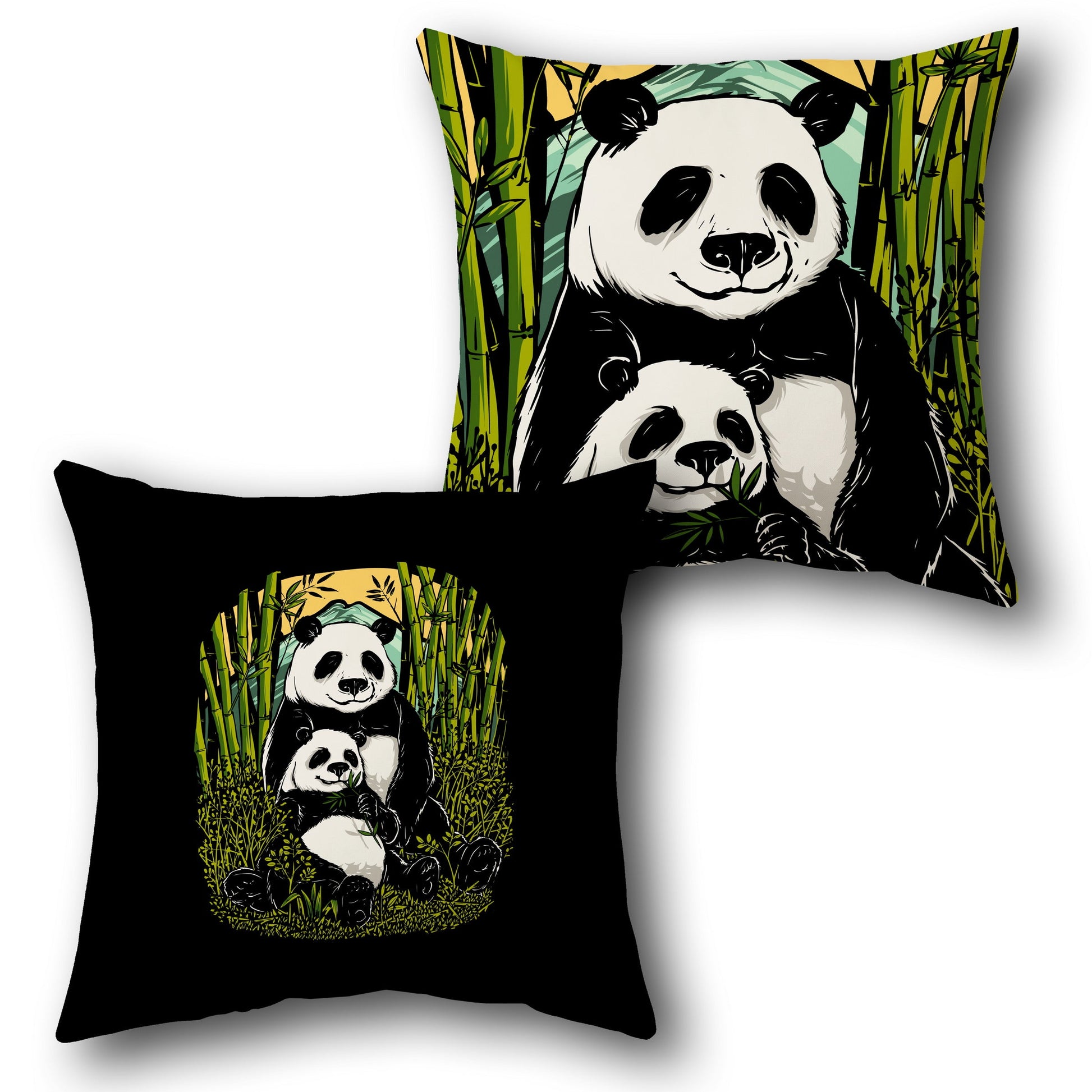 Celebrate the tender bond of a panda family with the Bamboo Snuggles Cushion . This charming features a panda and cub nestled in a lush bamboo forest. One Cushion highlights the pair in a close-up surrounded by greenery, while the other offers a full view of them lounging contentedly. With vivid colors and heartwarming illustration, these Cushions bring serene wilderness charm and familial warmth to your home.