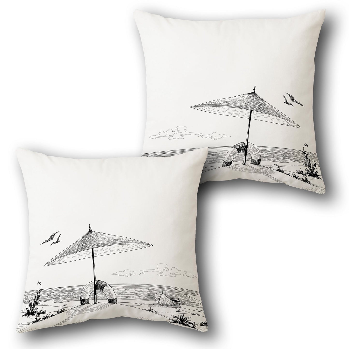 A white throw Cushions featuring a minimalist black-and-white sketch of a beach scene. The design includes a beach umbrella, a life preserver, a small boat, and birds flying over the ocean, adding a simple, coastal charm to your home decor.