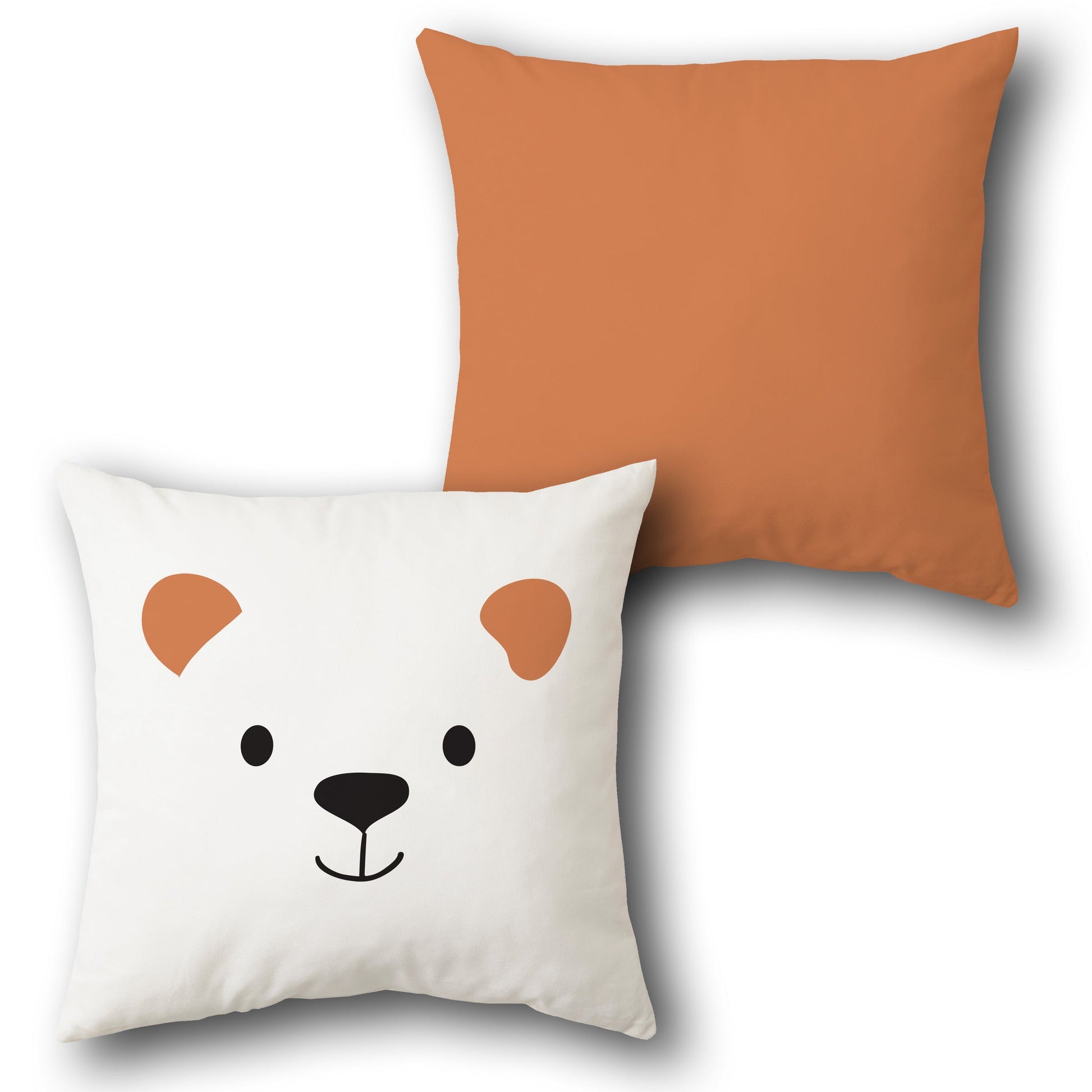 This adorable Cushion design features two complementary pieces. The front Cushion displays a cute bear face illustration on a soft white base, with charming brown ears and expressive black facial features. The back Cushion is solid in a warm terracotta orange color, providing a balanced and cozy aesthetic. Perfect for kids’ rooms, nurseries, or playful home decor.