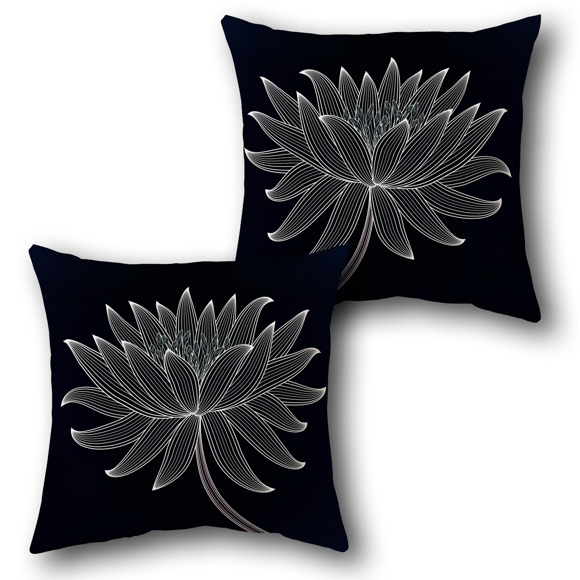 This cushion features a stunning lotus flower design on both the front and back, with detailed white line art showcasing the petals against a deep black base color. The intricate lotus pattern adds an elegant and serene touch to the cushion's overall look.