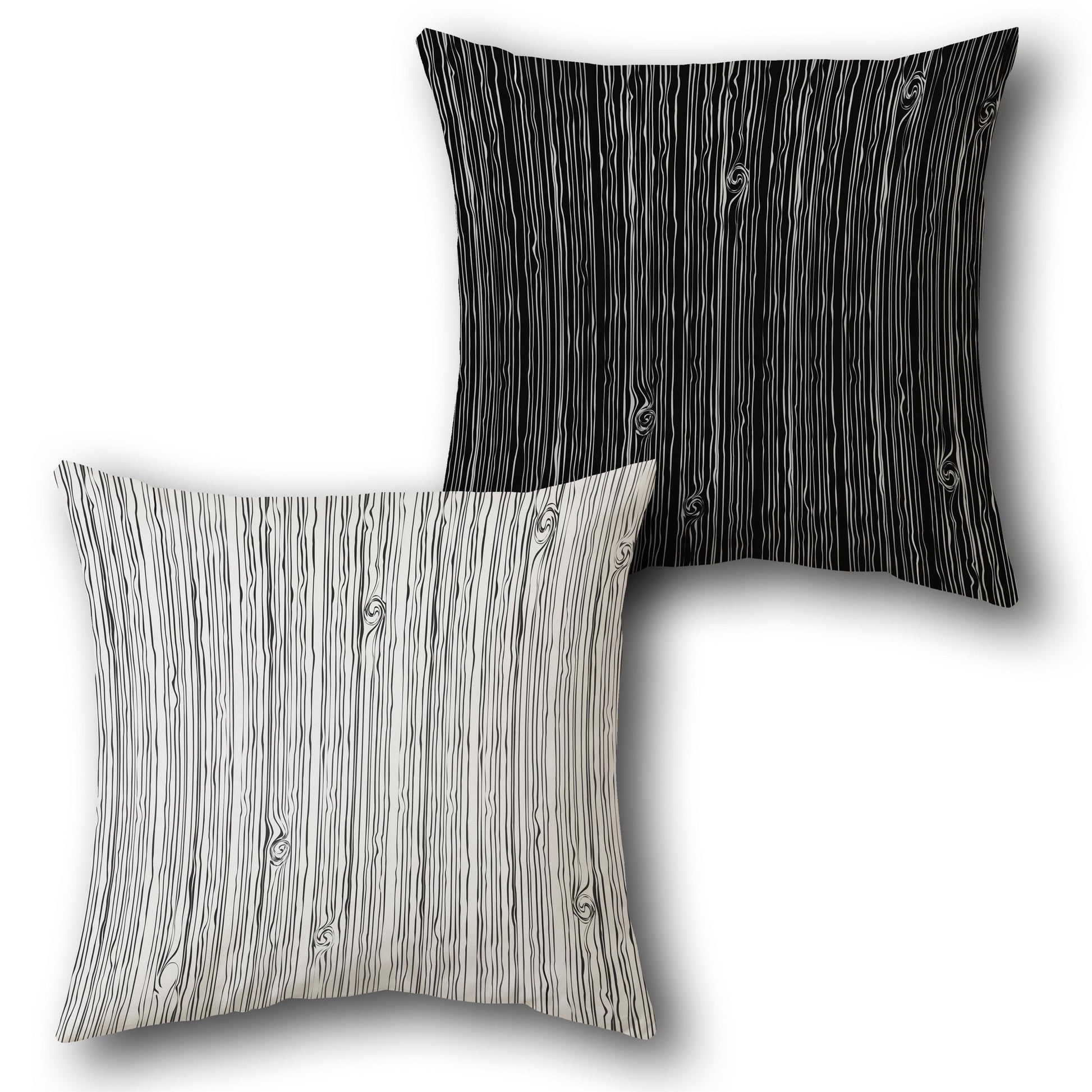 This cushion features a front design with a white base color, decorated with a detailed wood grain pattern in black, creating a rustic and natural look. The back of the cushion has a black base with the same white wood grain pattern, maintaining a cohesive and earthy aesthetic on both sides.
