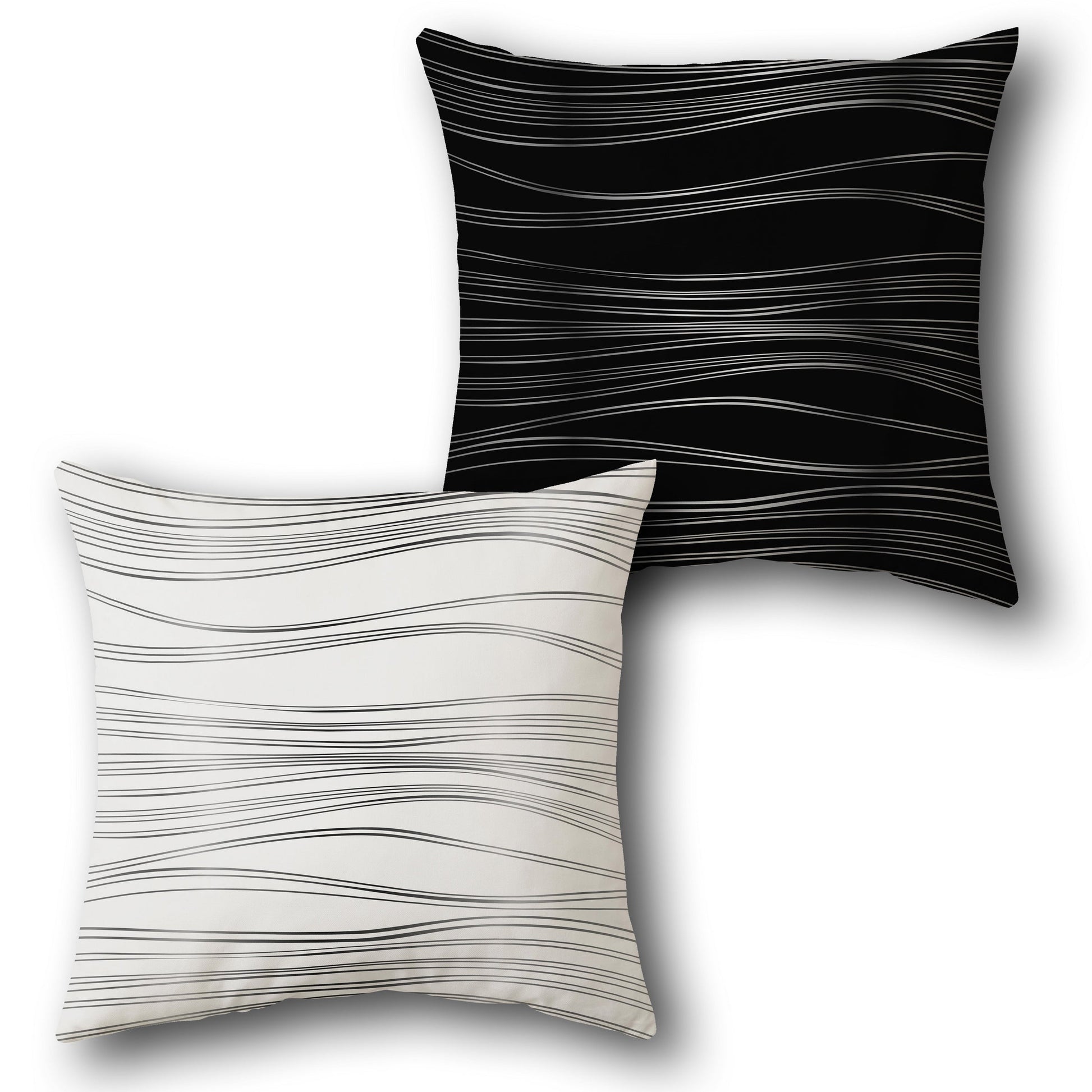 This cushion features a sleek front design with wavy black lines on a white base, creating a modern, flowing pattern. The back showcases the same wavy pattern but with white lines on a solid black base, offering a striking contrast.