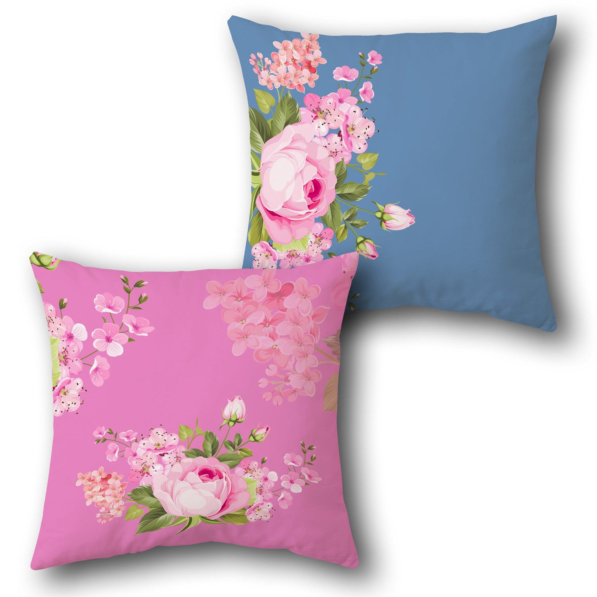 A of decorative Cushions featuring a delicate floral design. The first Cushion showcases a bouquet of pink roses, cherry blossoms, and hydrangeas with green leaves on a vibrant pink base. The second Cushion has the same floral arrangement on the left side, with a solid slate blue on the right, creating a balanced contrast. Ideal for adding a touch of floral elegance to your decor.