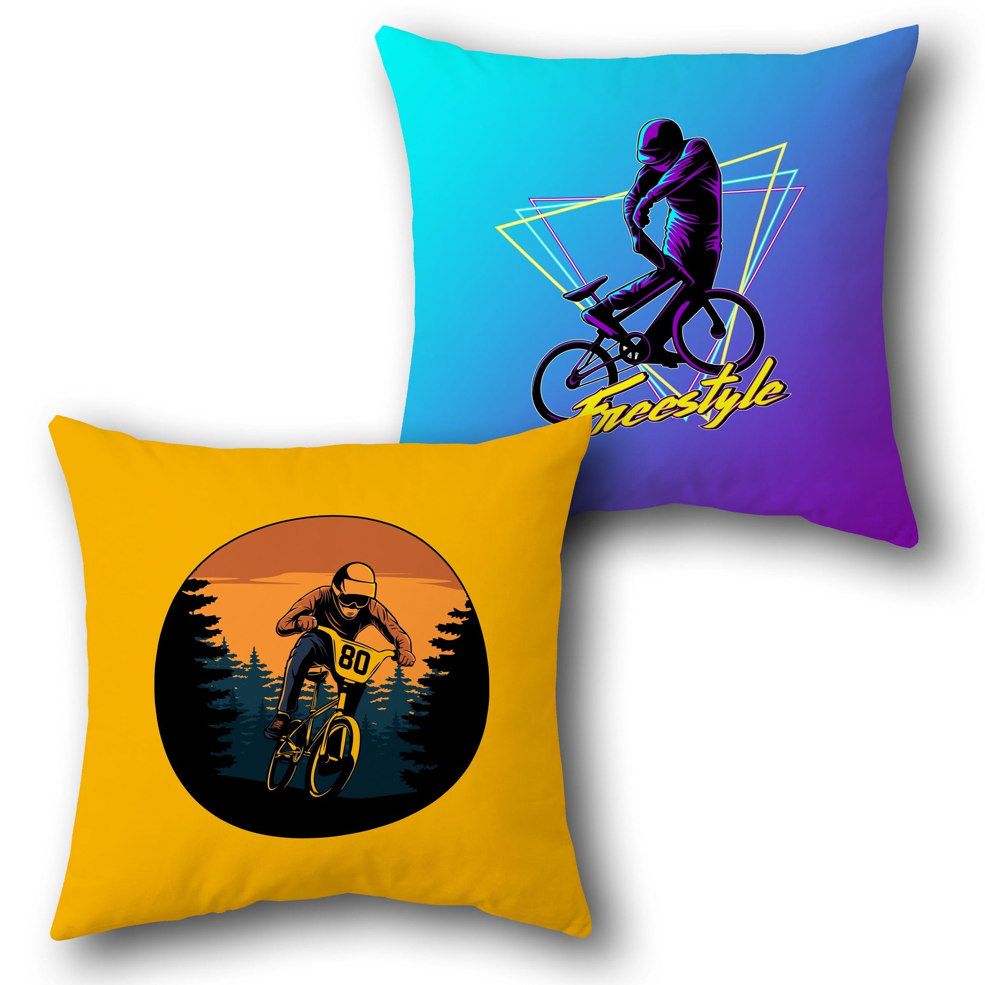 Rev up your decor with the BMX Freestyle Adventure Cushion – a dynamic that celebrates the spirit of extreme cycling. One Cushion bursts with neon flair, showing a rider performing tricks against a vibrant blue-to-purple gradient backdrop with retro geometric accents and the word “Freestyle.” The other captures a daring biker mid-jump in a rugged forest scene at sun. This is perfect for BMX fans, adrenaline junkies, or anyone who loves a bold and adventurous aesthetic.