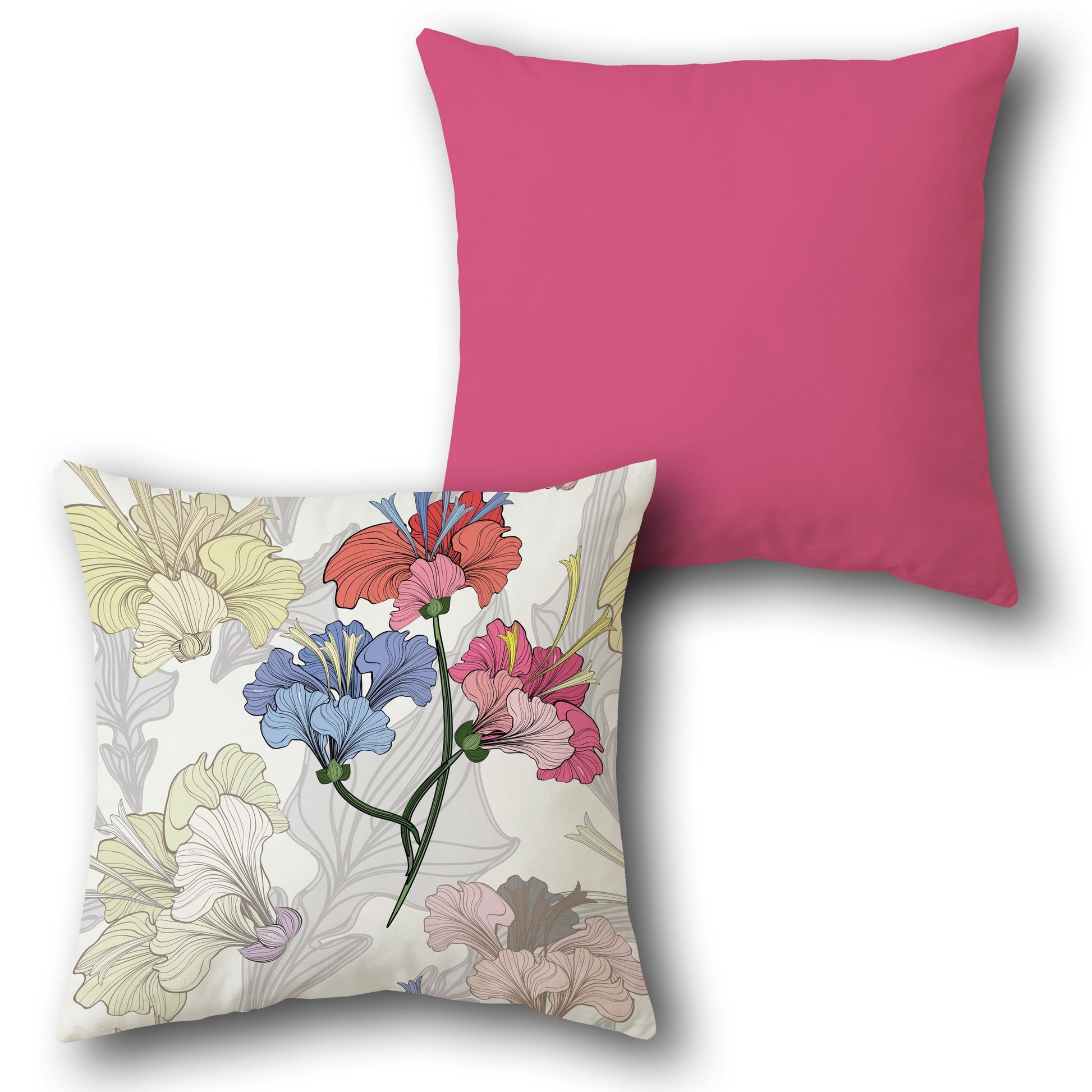 Add a lively splash of color to your decor with this Bold Floral Print Decorative Throw Cushion. The front features a vibrant floral design against a soft ivory base, showcasing an array of vivid hues like red, royal blue, hot pink, lavender, pale yellow, and peach. Complementing this colorful front is a solid bright pink reverse side that brings energy and warmth to any room. Crafted from premium fabric, this Cushion offers both visual appeal and cozy comfort—perfect for modern, boho, or eclectic interiors.