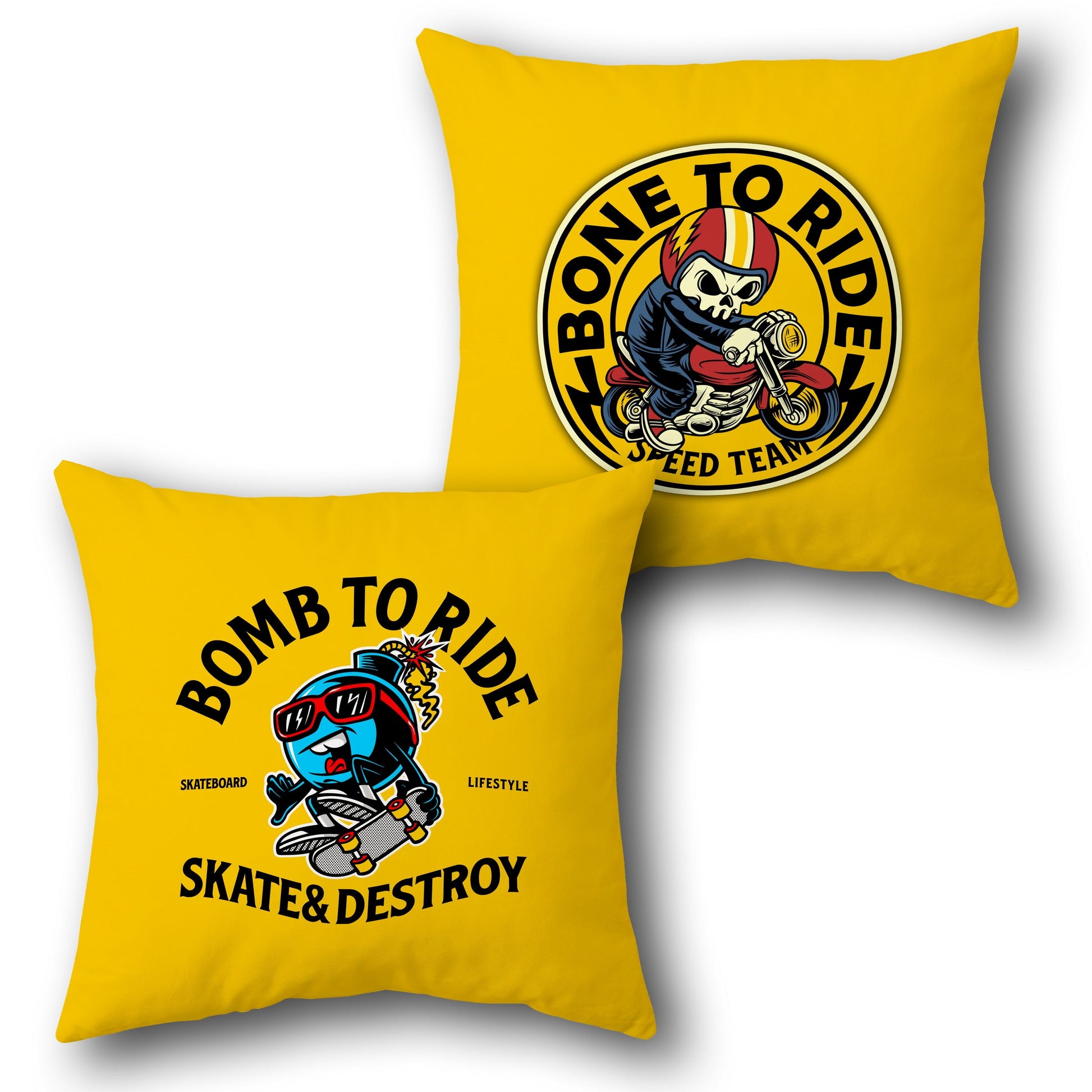 Inject bold energy into your room with the Bomb to Ride Action Cushion . These vibrant yellow Cushions feature edgy and fun designs: one with a bomb character on a skateboard exclaiming “Skate & Destroy,” and the other with a rebellious skeleton biker from the "Bone to Ride Speed Team." Perfect for skate enthusiasts, motorbike fans, or anyone who lives life on the edge, these Cushions bring the attitude of street culture into your living space.