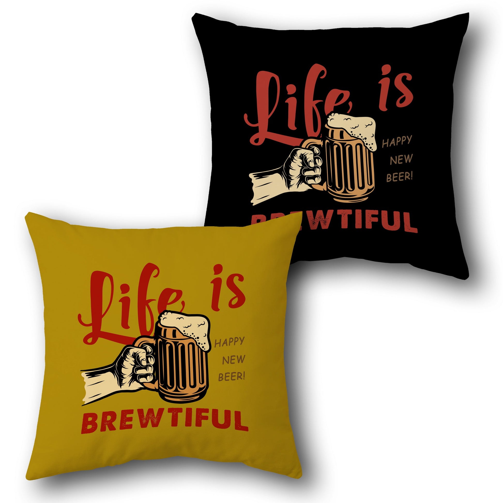 This single cushion features a cheerful design with a yellow base on the front, displaying the text "LIFE IS BREWTFUL" in red, with a graphic of two hands clinking beer mugs in beige, and "HAPPY NEW BEER!" in smaller red text. The back side has a black base with the same design and text, maintaining the fun and celebratory theme.
