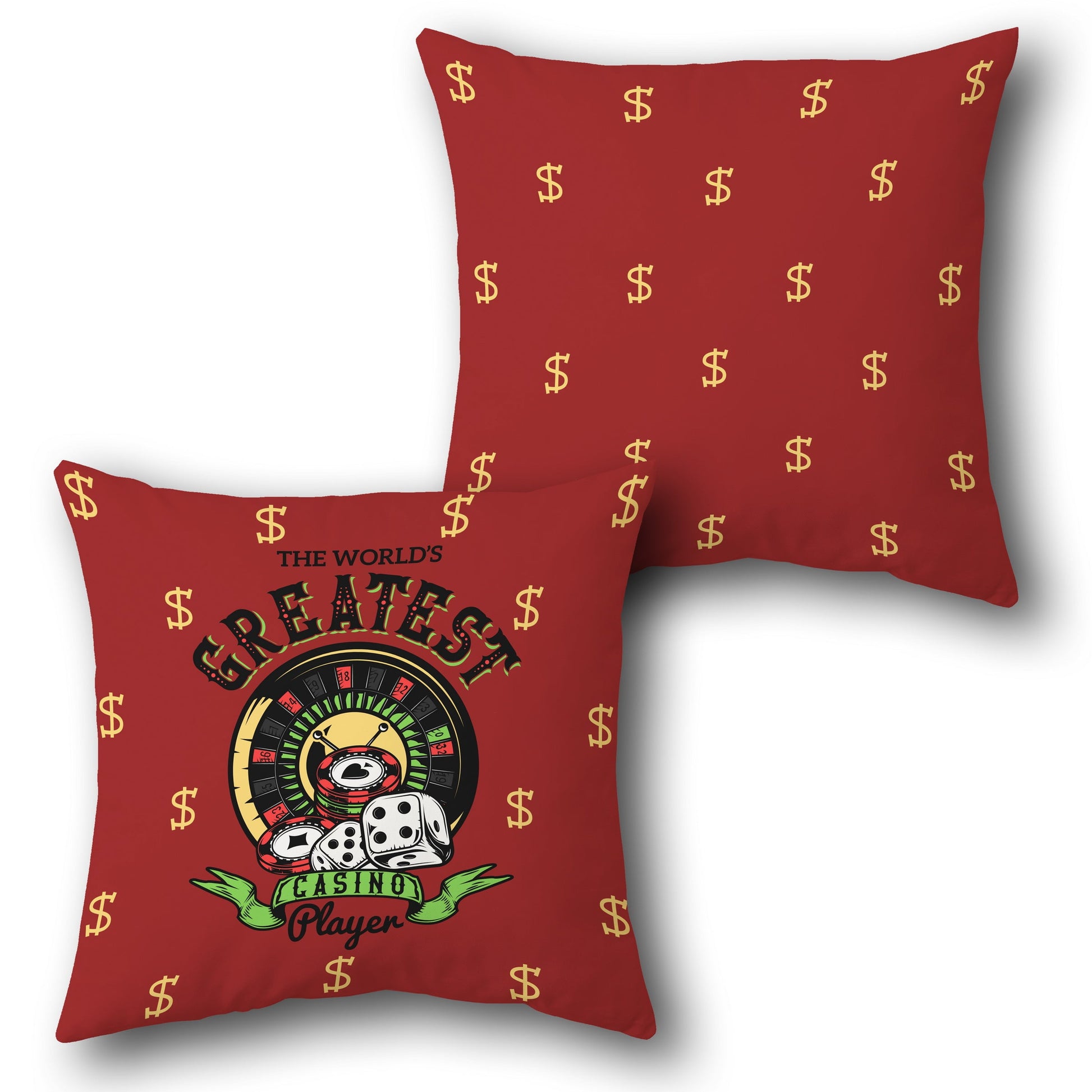 Roll the dice in style with this Casino Champion Throw Cushion in a rich red color. One Cushion boldly declares "The World's Greatest Casino Player" with a roulette wheel and dice graphic, while the other features a subtle dollar sign pattern on a solid red background. Cushions have a red base color with gold accents, perfect for adding a touch of Vegas flair to your space. Ideal for casino enthusiasts, these Cushions bring a playful vibe to your living room, bedroom, or game room.