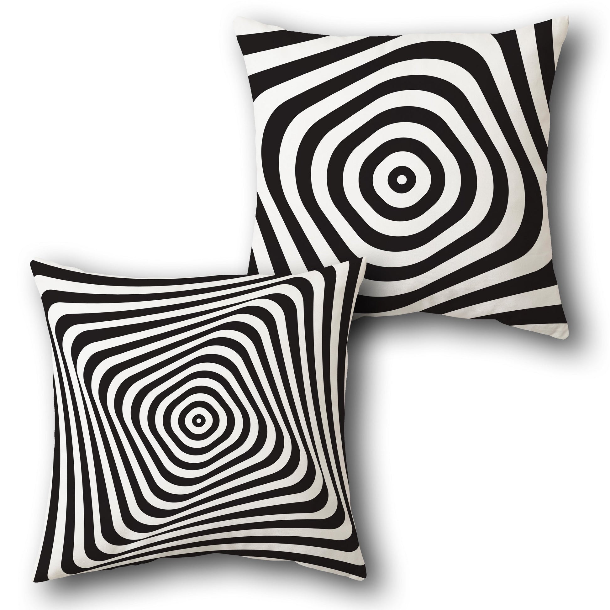 A two bold Cushions featuring a striking black and white concentric square spiral pattern, creating a mesmerizing optical effect, perfect for adding a modern, geometric touch to your decor.