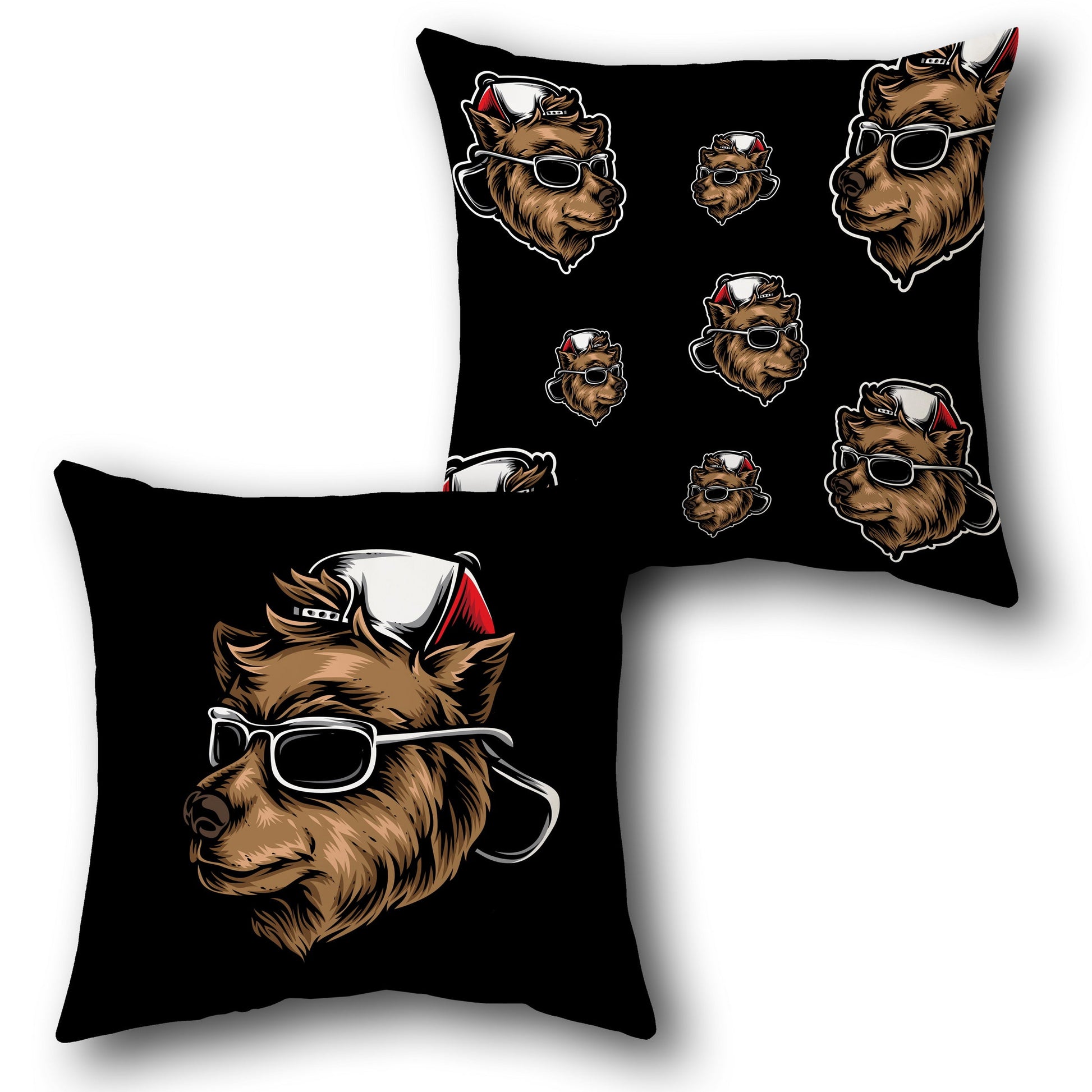 This trendy cushion features a hipster bear design, showcasing a bear wearing sunglasses and a cap. One side displays a large bear illustration in brown with white and red accents, set against a black base. The other side has a repeating pattern of smaller bear heads with the same design, also on a black base. Perfect for those who love quirky, modern decor with an animal twist.