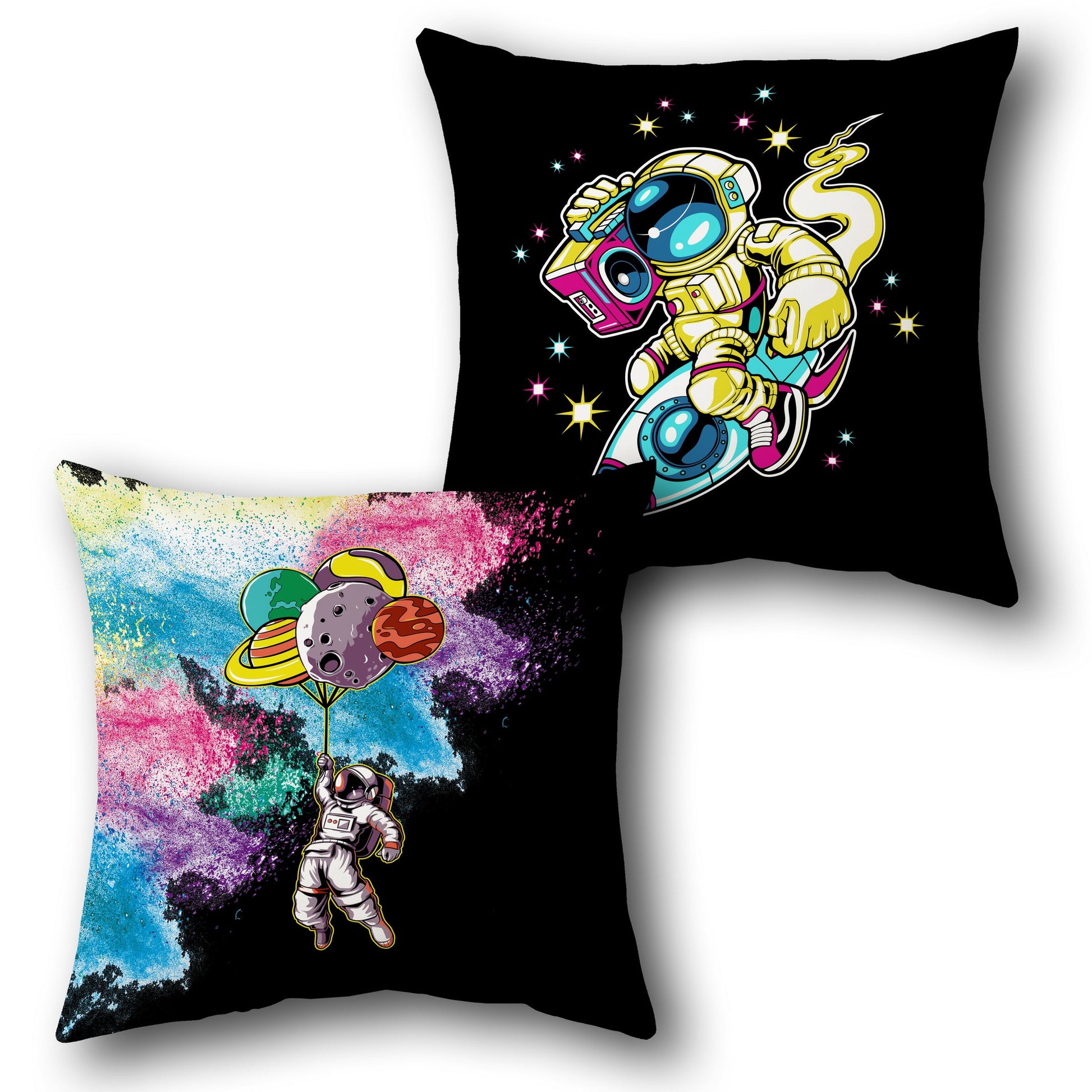 Turn up the cosmic energy in your space with this vibrant Cushion , perfect for those who dream beyond the stars. One Cushion showcases a playful astronaut riding a rocket while blasting tunes from a neon boombox, surrounded by glowing stars. The other features an awe-inspiring scene of an astronaut floating through a colorful nebula, holding planetary balloons that soar into the cosmic unknown. These bold, artistic designs are a perfect blend of retro vibes and futuristic imagination.