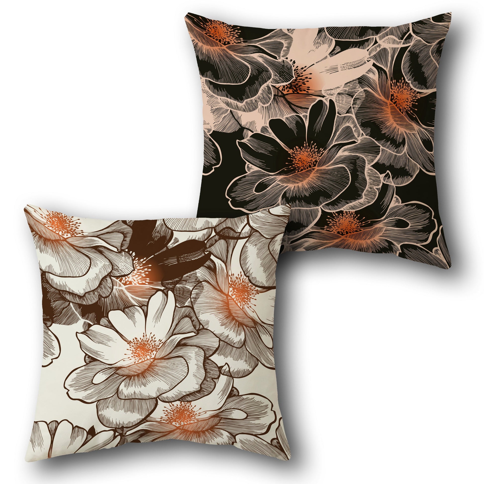 This cushion features a detailed floral bloom design on both the front and back. One side showcases large, intricately drawn flowers in shades of black and brown with orange centers on a cream background, while the other side displays the same floral pattern in white and black with orange centers on a dark black base, creating a striking contrast for a sophisticated look.