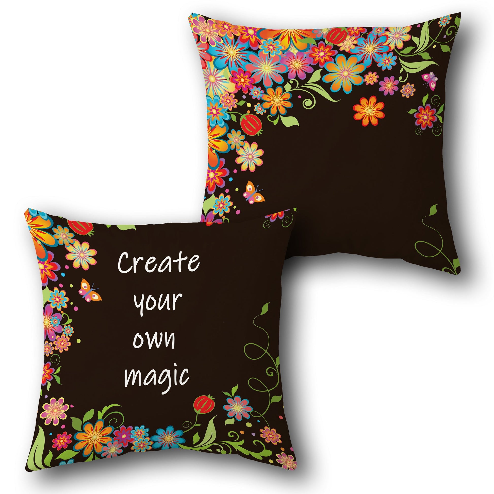 This enchanting Create Your Own Magic Cushion includes deep brown . One Cushion features the inspiring phrase "Create your own magic" in white text, framed by a vibrant floral border with colorful flowers in shades of red, orange, blue, and pink, accented with green leaves and butterflies. The other Cushion showcases the same floral border design without the text, maintaining a cohesive look. These are perfect for adding a magical and uplifting touch to any space, ideal for living rooms, bedrooms, or as a motivational accent piece.