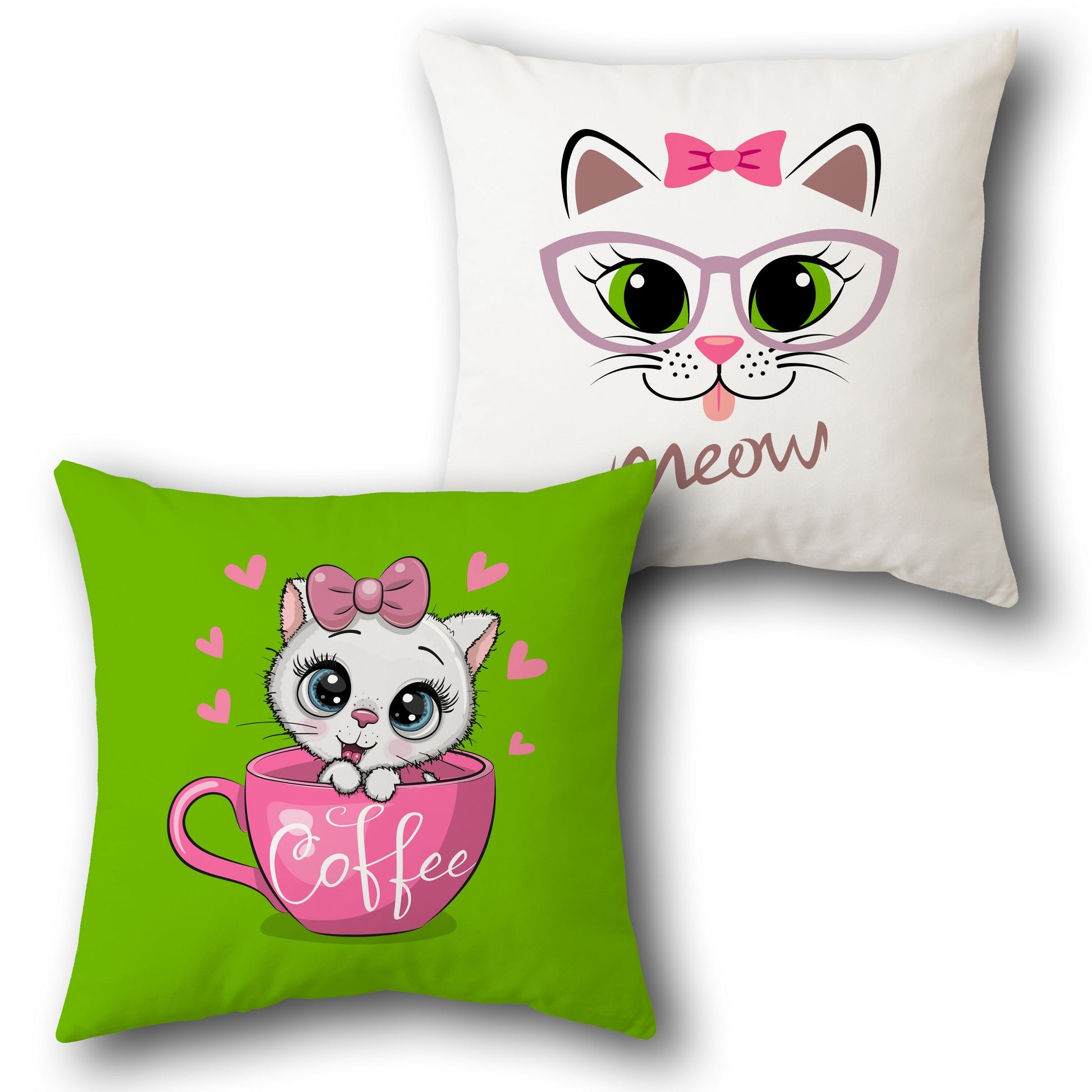 Add a purr-fectly adorable touch to your space with the Cute Cat & Coffee Cushion . Featuring a big-eyed kitten with a pink bow peeking out of a coffee cup on one Cushion and a chic cat face with glasses and the word "meow" on the other, this brings a cozy blend of charm and sass. Perfect for cat lovers, coffee addicts, or anyone who enjoys kawaii and playful decor.