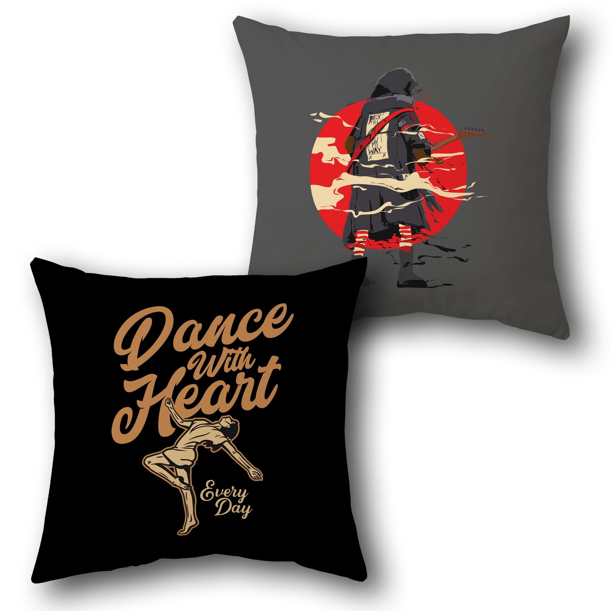 This cushion features a front and back design with a passionate dance theme. The front displays the text "DANCE WITH HEART" in a cursive bronze font, with a dancing figure and "EVERY DAY" in smaller text, on a kala (black) base color. The back showcases a stylized figure with a guitar against a red and white circular background, on a dhool (grey) base color, creating an artistic and expressive look.