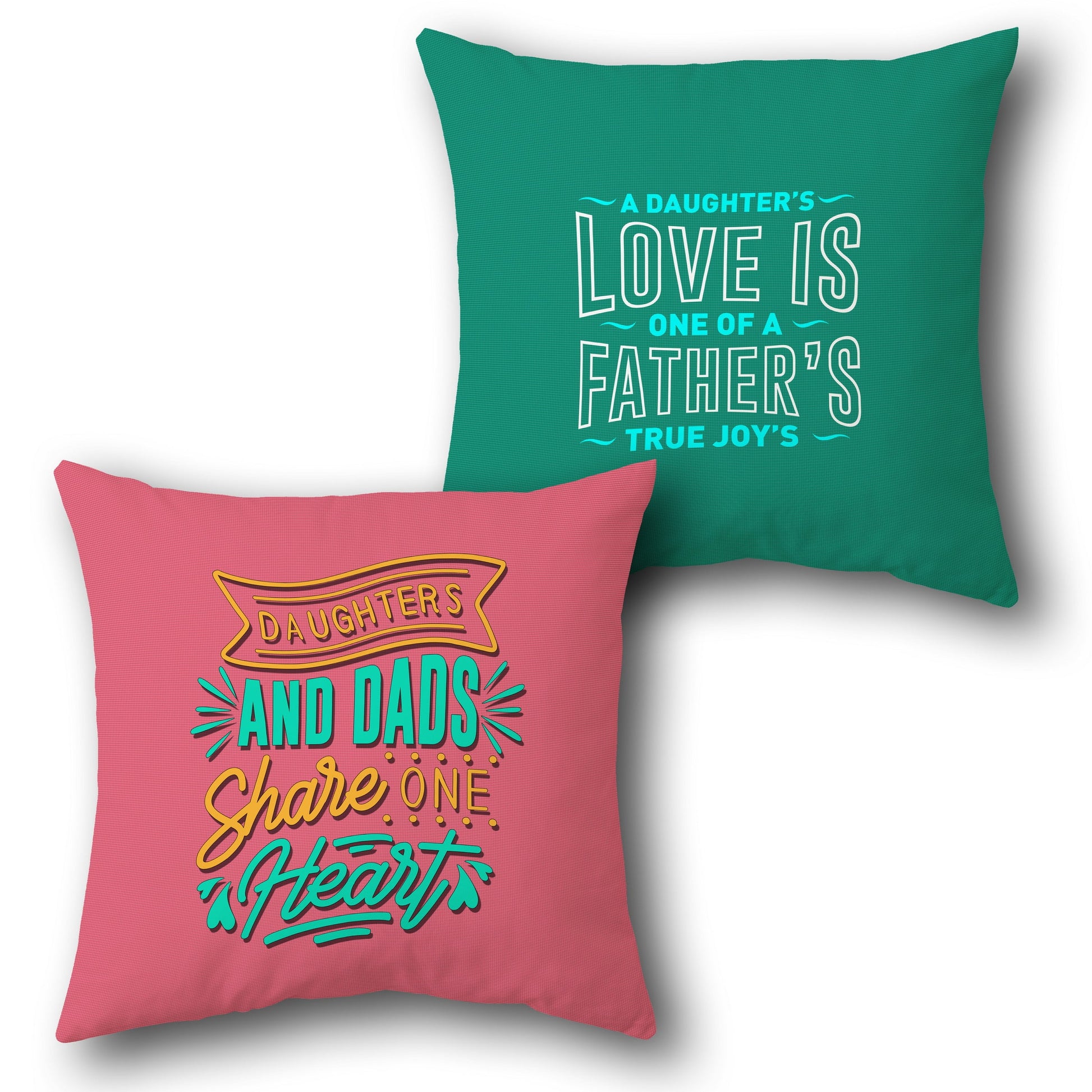 This single cushion celebrates the special bond between daughters and fathers with a dual design. The front side features a bright pink base with the text "DAUGHTERS AND DADS Share one HEART" in teal, yellow, and white, accented with small decorative elements like hearts and stars. The back side has a teal green base with the phrase "A DAUGHTER'S LOVE IS ONE OF A FATHER'S TRUE JOY'S" in white and teal cursive, with subtle wave accents. A heartfelt gift or decor piece for a father-daughter duo.