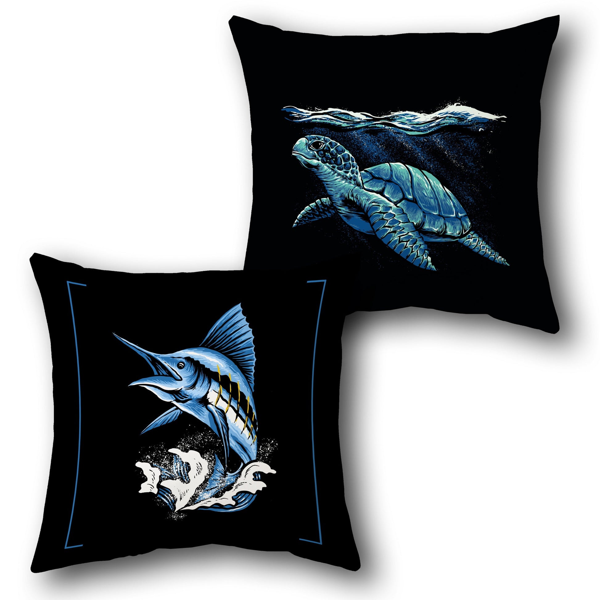Dive into the oceanic depths with this striking marine-themed Cushion design . Featuring high-contrast artwork against a bold black background, one Cushion showcases a majestic sea turtle swimming just below the ocean surface, while the other displays a dynamic swordfish leaping through powerful waves. Perfect for ocean lovers and nautical decor themes, this brings the spirit of the sea to your space.