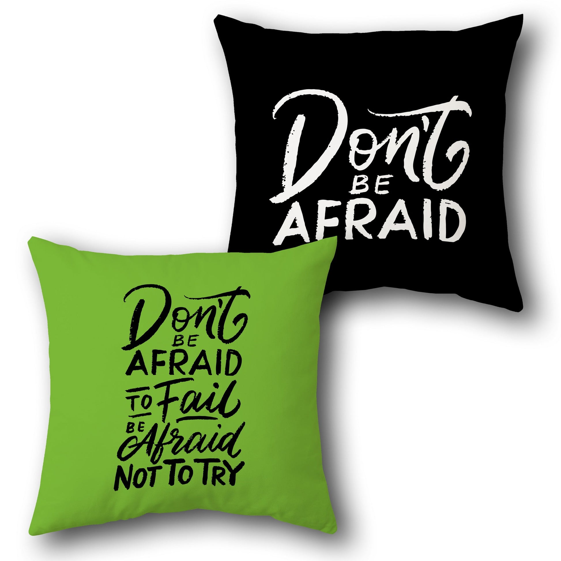 This motivational cushion features the inspiring text "Don't Be Afraid to Fail Be Afraid Not to Try" on the front, set against a bright green base color. The text is in a bold black script with a white outline, creating a striking contrast. The back of the cushion is a solid black color, complementing the vibrant front design.