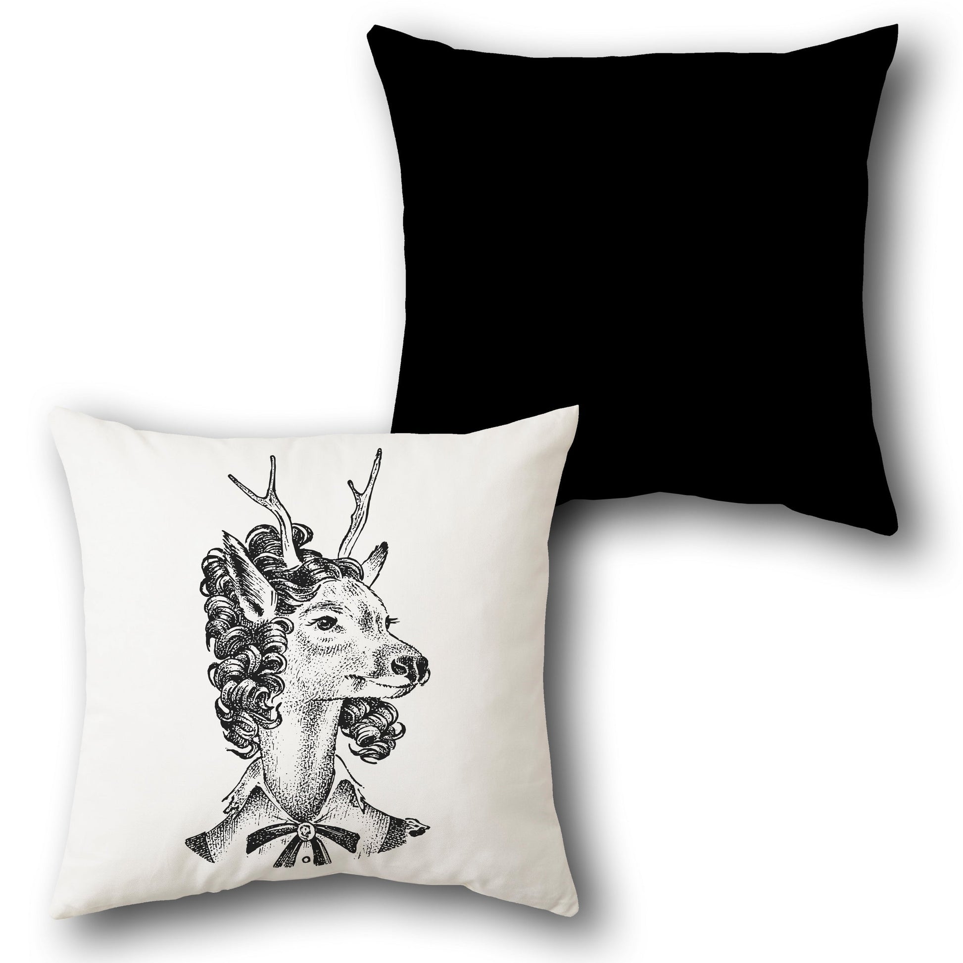 This includes two square Cushions. The first Cushion has a white base color with a detailed black illustration of a deer with antlers, styled with curly hair and a bow tie, dressed in a formal outfit. The second Cushion has a solid black base color, providing a striking contrast to the design of the first.