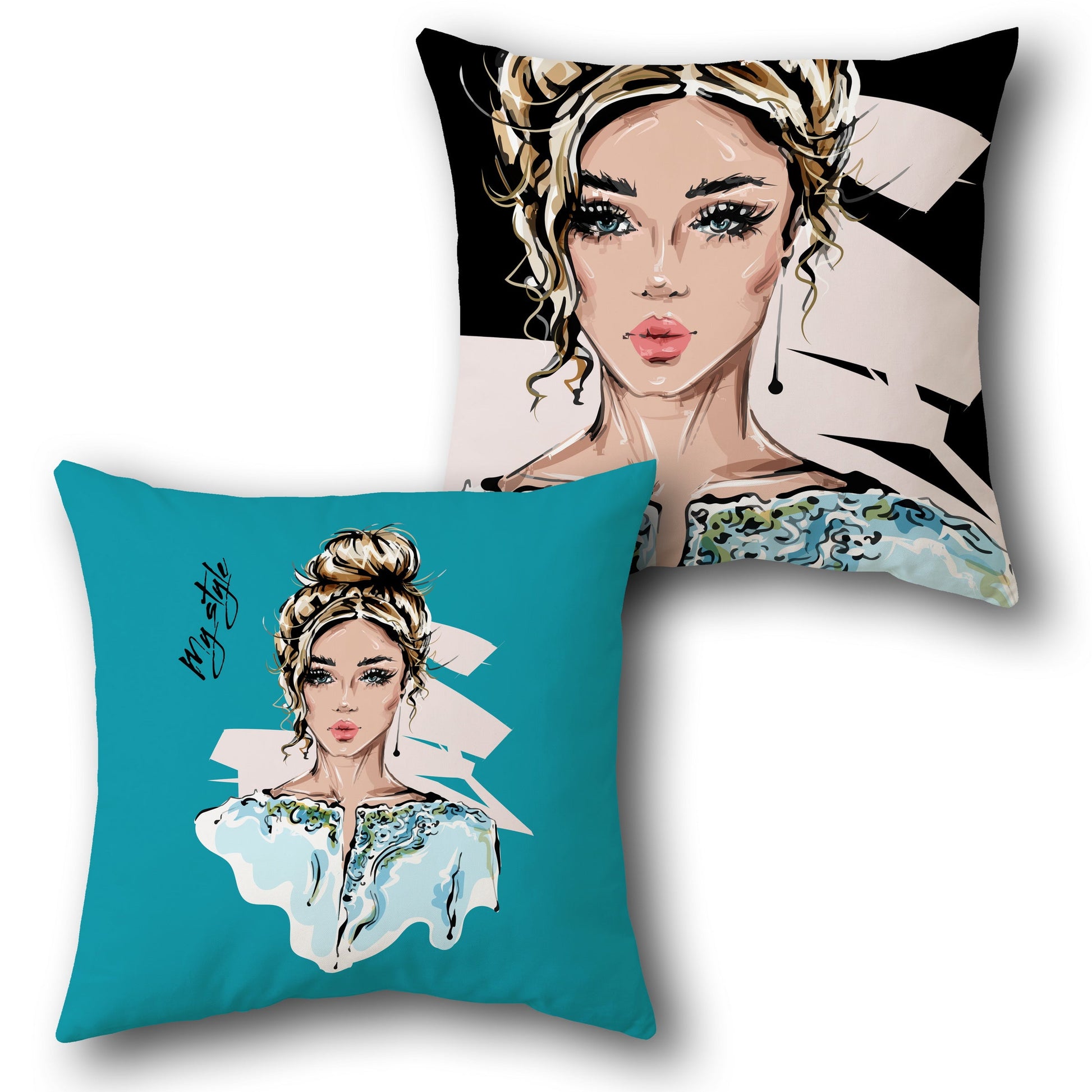 This single cushion features a sophisticated lady illustration on both sides. The front showcases a stylish woman with a bun, wearing a detailed blue outfit, set against a teal base color with "MY STYLE" text. The back highlights the same elegant lady with a black base color, emphasizing her intricate attire. The teal and black base colors create a refined, artistic contrast.