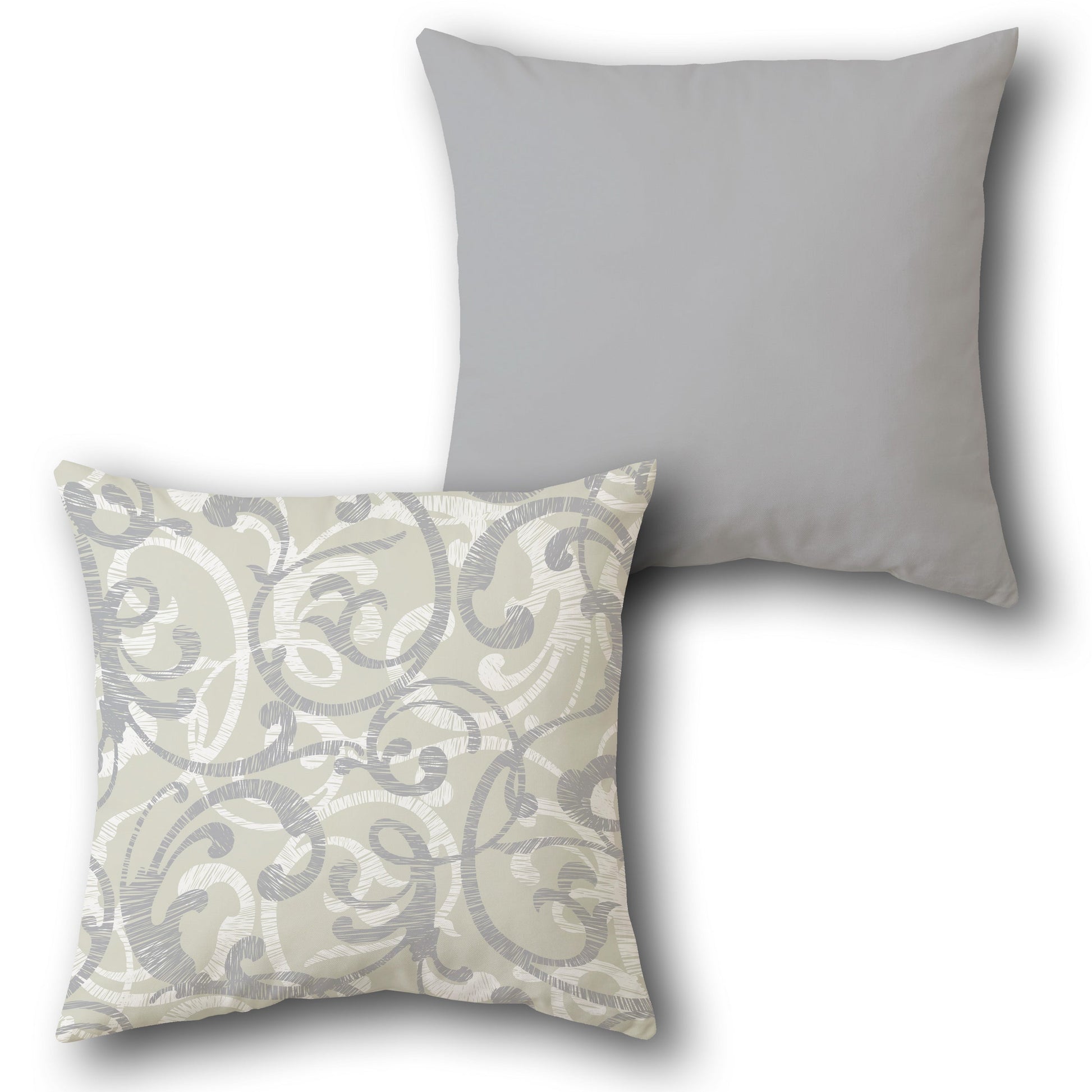 This cushion features a dual-sided design with a refined aesthetic. The front showcases an intricate swirl pattern in shades of grey and white on a light beige base, creating a subtle yet elegant look with its flowing, cursive-like design. The back is a solid light grey, offering a minimalist contrast that complements the ornate front. The neutral tones of beige, grey, and white give it a sophisticated and timeless appeal.