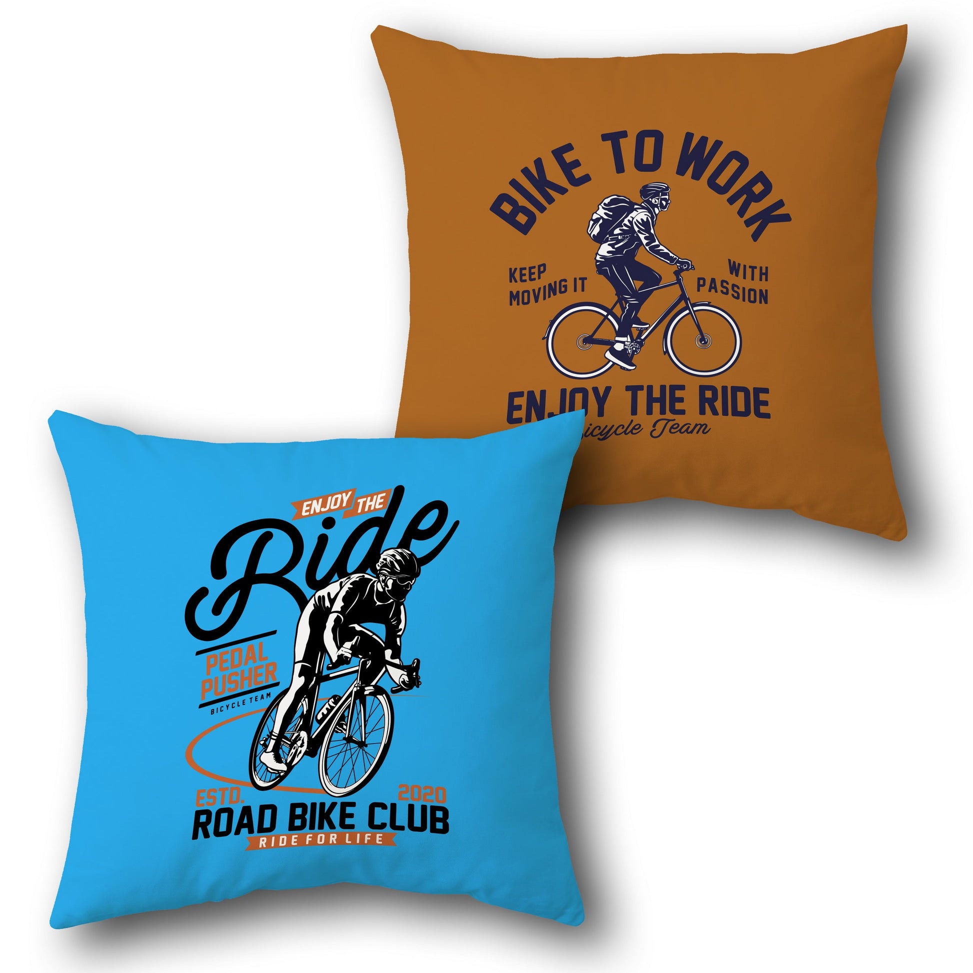 This single cushion features a cycling-themed design with a front and back print. The front side has a bright blue (neela shade) base with an illustration of a cyclist and the text "ENJOY THE Ride" in large black cursive, "PEDAL PUSHER BICYCLE TEAM" in orange, and "EST 2020 ROAD BIKE CLUB RIDE FOR LIFE" in black. The back side has a rust brown (bhura shade) base with a graphic of a cyclist with a backpack, and the text "BIKE TO WORK" in black, "KEEP MOVING WITH PASSION ENJOY THE RIDE" in black, and "BICYCLE TEAM" in white. Ideal for cycling enthusiasts.