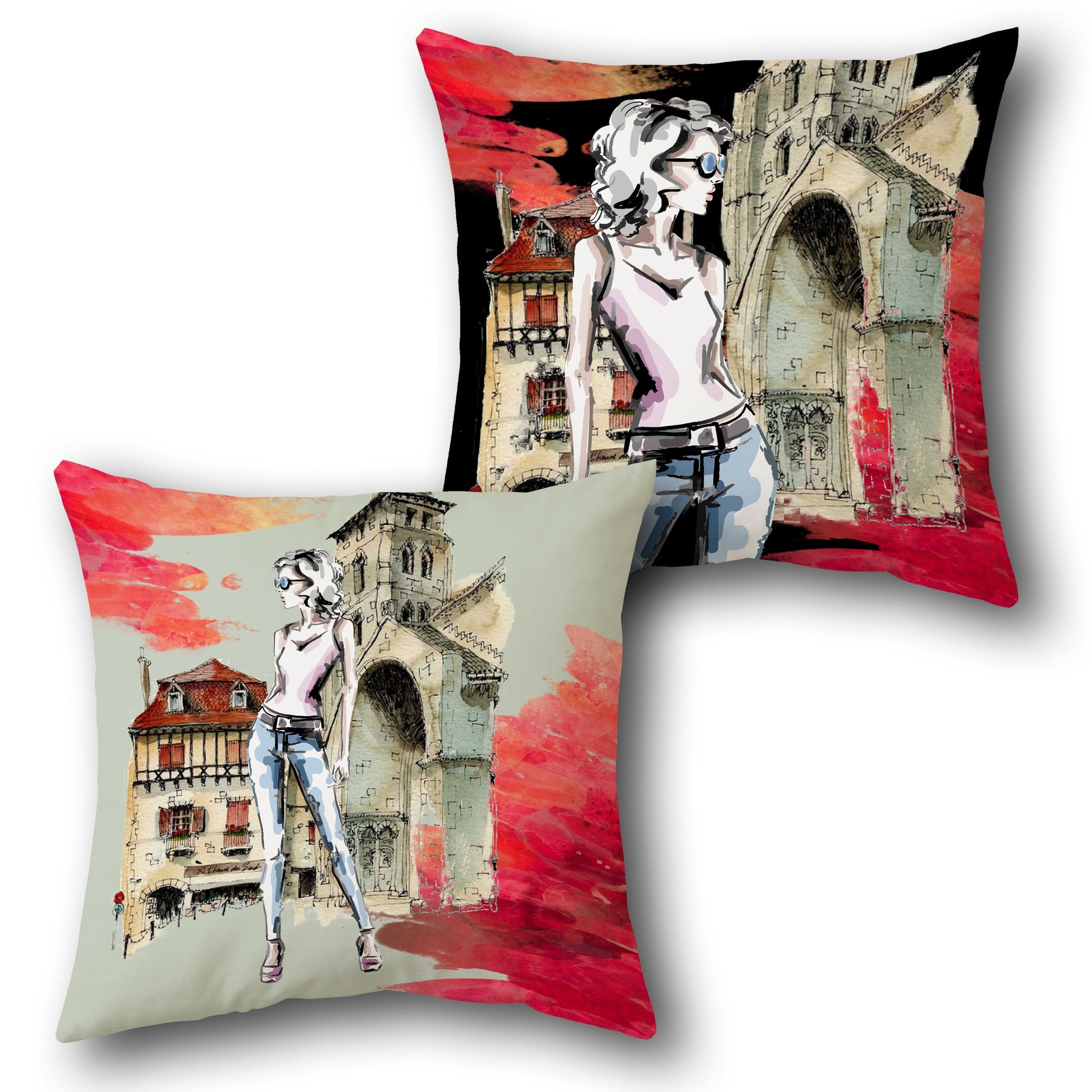 This single cushion features a European city-themed lady illustration on both sides. The front showcases a stylish woman in a white top and jeans, standing in front of an arched stone structure and a traditional building with a red roof, set against a red base color with watercolor splashes in pink and orange. The back depicts the same lady with sunglasses, with the same architectural background, on a black base color. The red and black base colors create a bold, cultural contrast.