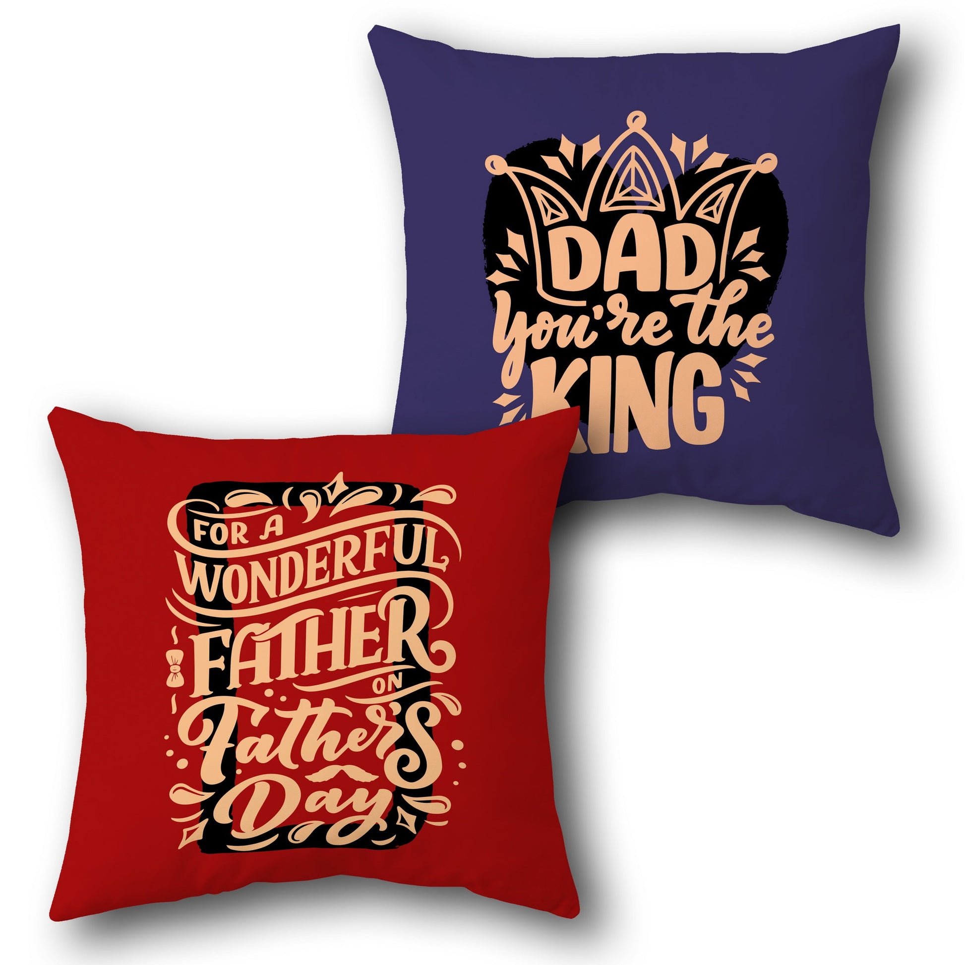 This single cushion features a dual-sided design celebrating Father's Day. The front side is a vibrant red (similar to the desi color "lal") with the text "FOR A WONDERFUL FATHER ON FATHER'S DAY" in cream, styled with elegant flourishes. The back side is a deep navy blue (akin to the desi color "neela") with the text "DAD YOU'RE THE KING" in cream, accented with a crown graphic and a heart background. The base colors are red and navy blue, creating a festive and regal contrast.