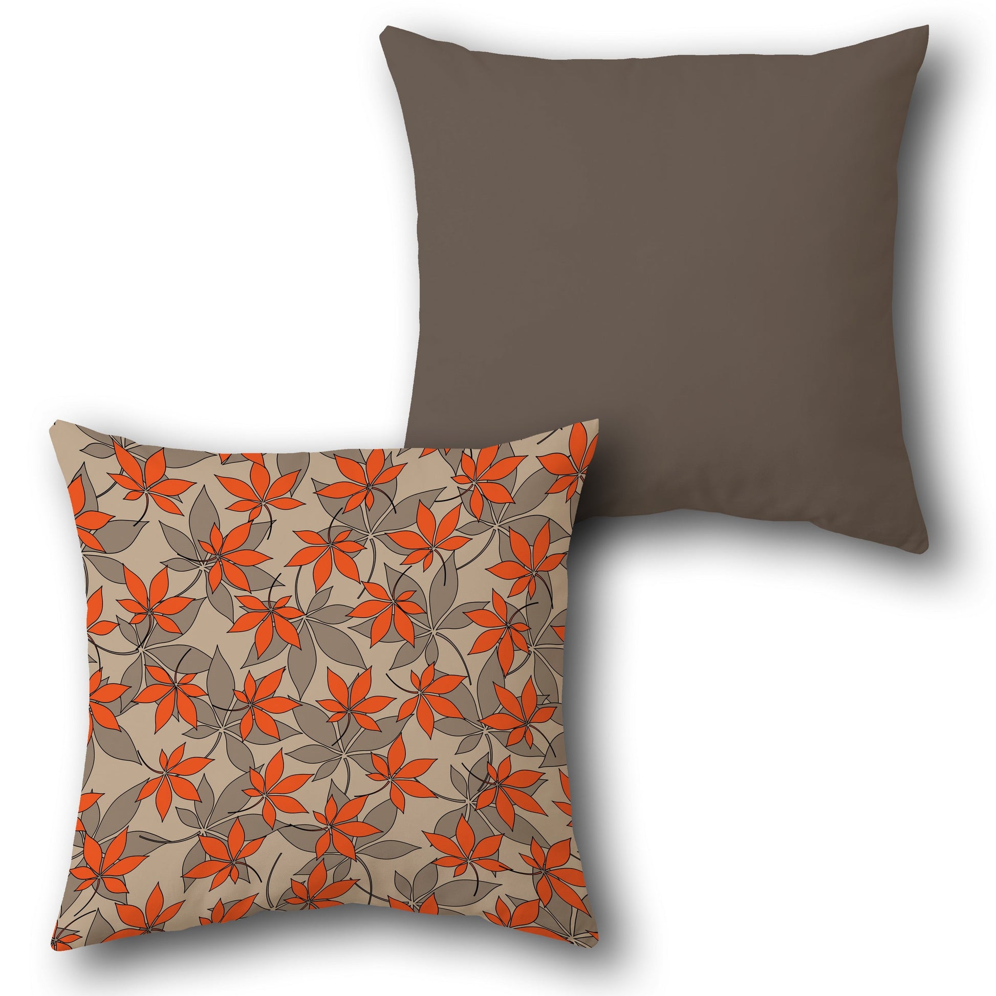 This cushion features a front with a vibrant floral pattern in orange and taupe on a cream base, creating a warm and inviting look. The back is a solid taupe, offering a neutral contrast to the lively front.