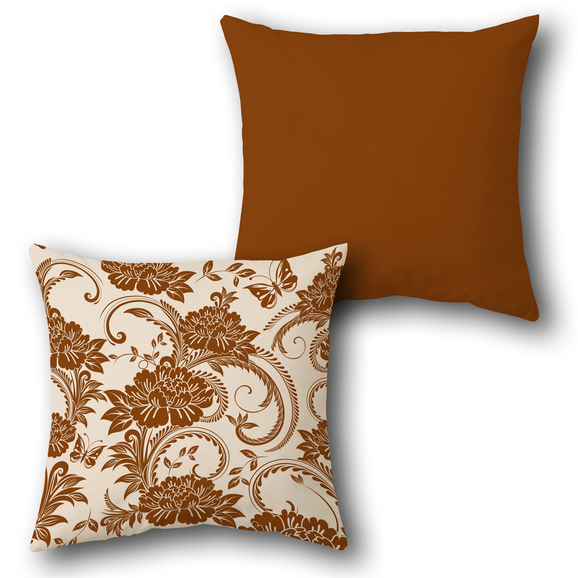 This cushion features a front with a detailed floral pattern in terracotta on a cream base, creating a rich and elegant look with intricate swirls and blooms. The back is a solid terracotta, offering a warm contrast to the ornate front.