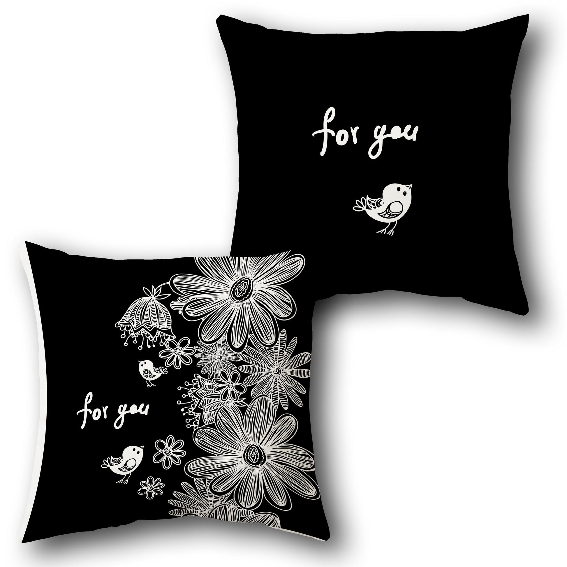 This cushion features a charming front design with a floral pattern, including large and small flowers, bell-shaped blooms, and two birds, all in white line art. The phrase "for you" is written in a playful script, adding a personal touch. The base color of both the front and back is black, while the back has a simpler design with just the phrase "for you" and a single bird in white.