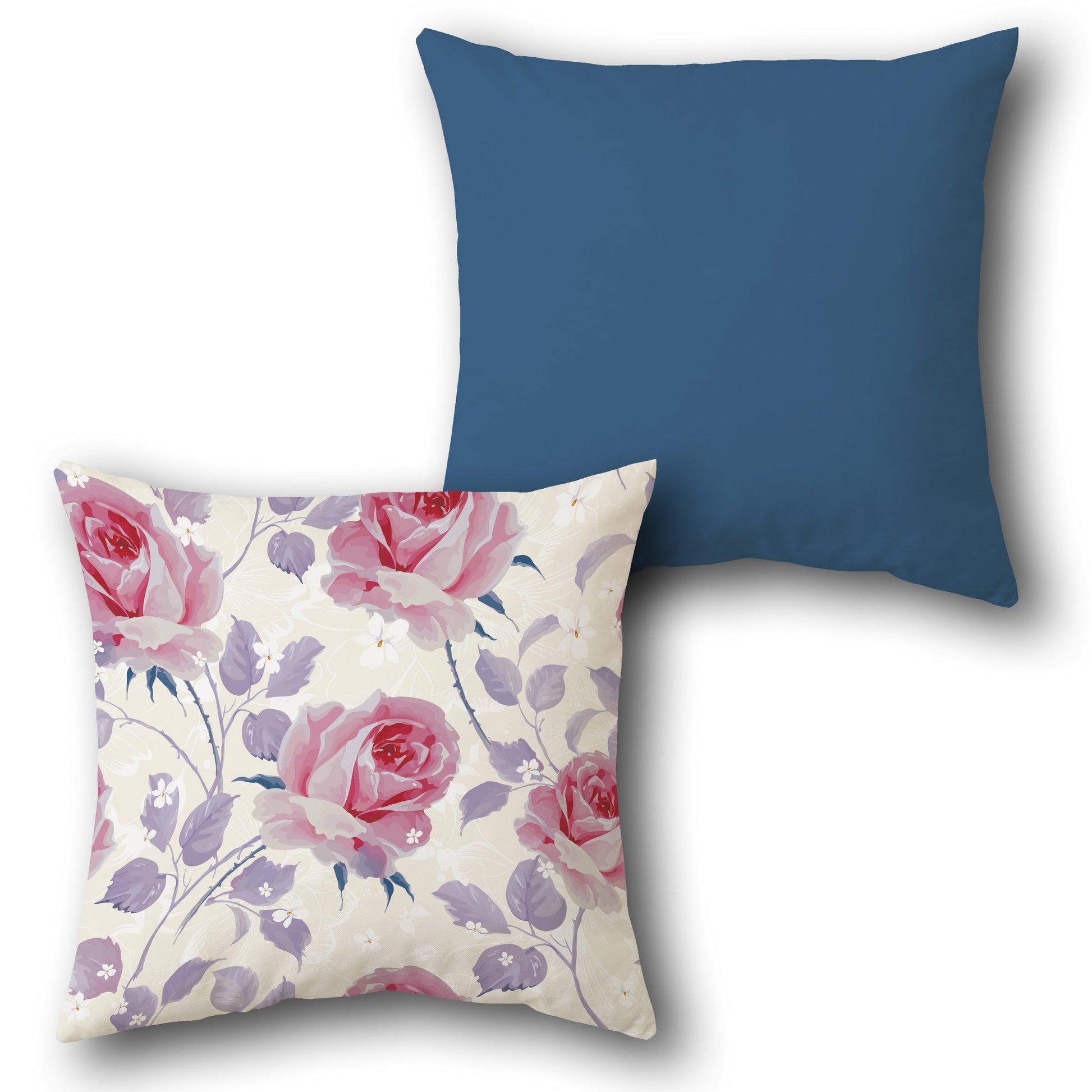 A of square accent Cushions. One Cushion features a delicate floral pattern with pink roses, purple leaves, and small white flowers on a cream base, adding a vintage charm. The other Cushion is a solid deep blue, providing a bold contrast for versatile styling in home decor.