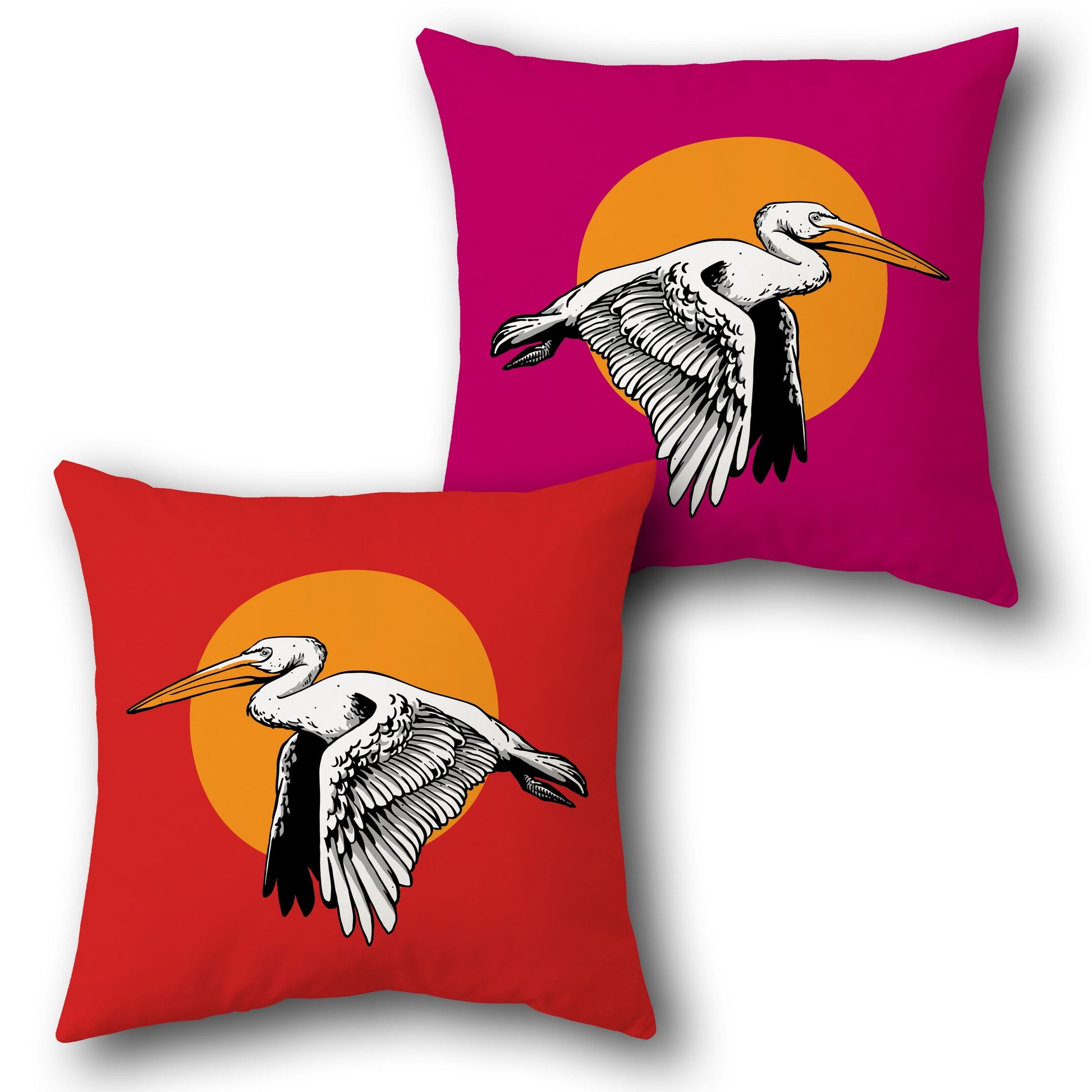 This Cushion features an illustration of a pelican in flight, with detailed wings spread wide, against a bold orange circular background resembling a ting or rising sun. The base color of the Cushion is a vibrant red-magenta, creating a striking contrast with the black and white pelican and the orange circle. sides of the Cushion display the same design.