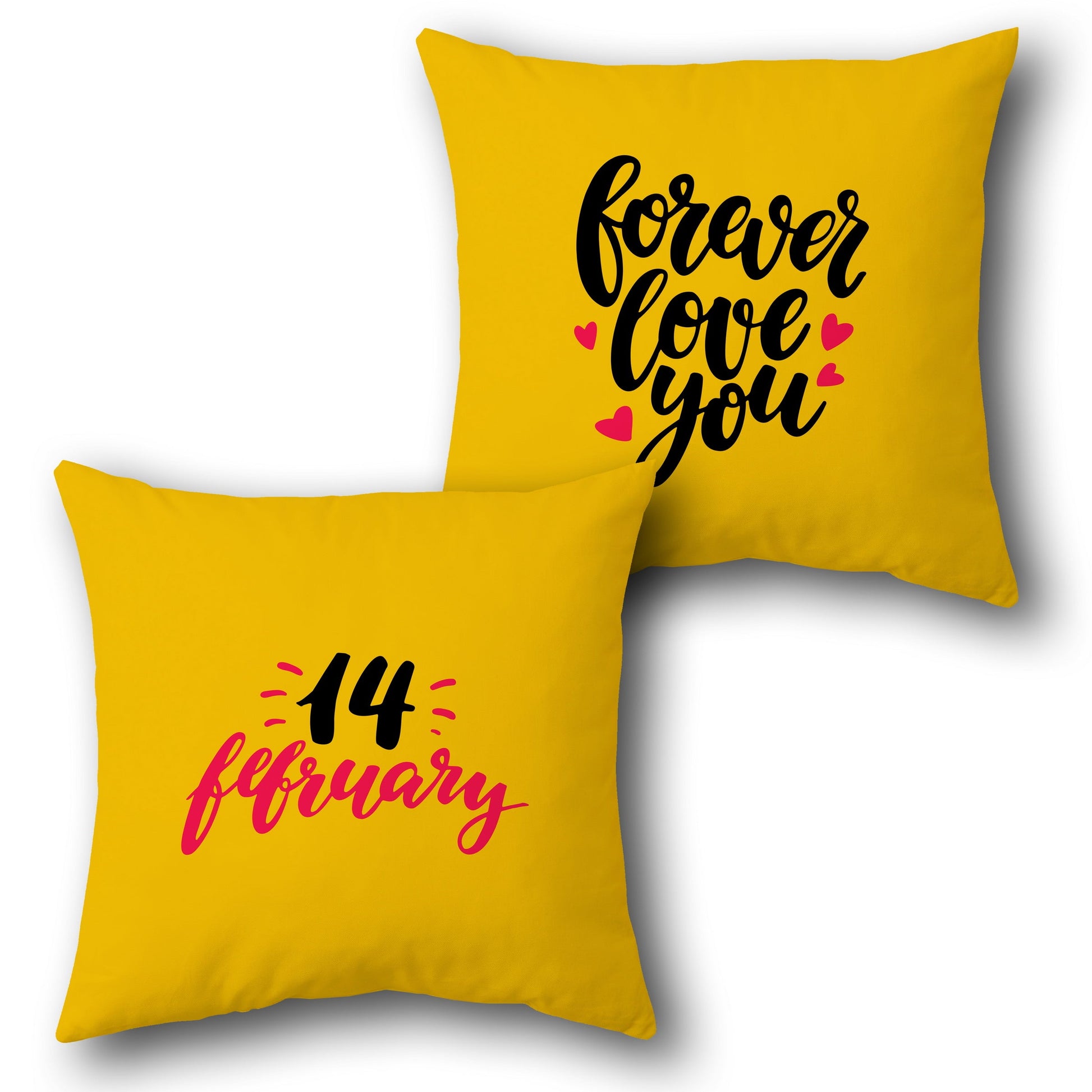 Celebrate the spirit of love with this vibrant Valentine's Cushion design . Featuring eye-catching cushions, one reads "Forever Love You" adorned with cute pink hearts, and the other marks the romantic date with "14 February" in a stylish font. The lively yellow base color makes this a cheerful and heartfelt addition to any home décor, perfect for expressing affection on Valentine’s Day or all year round