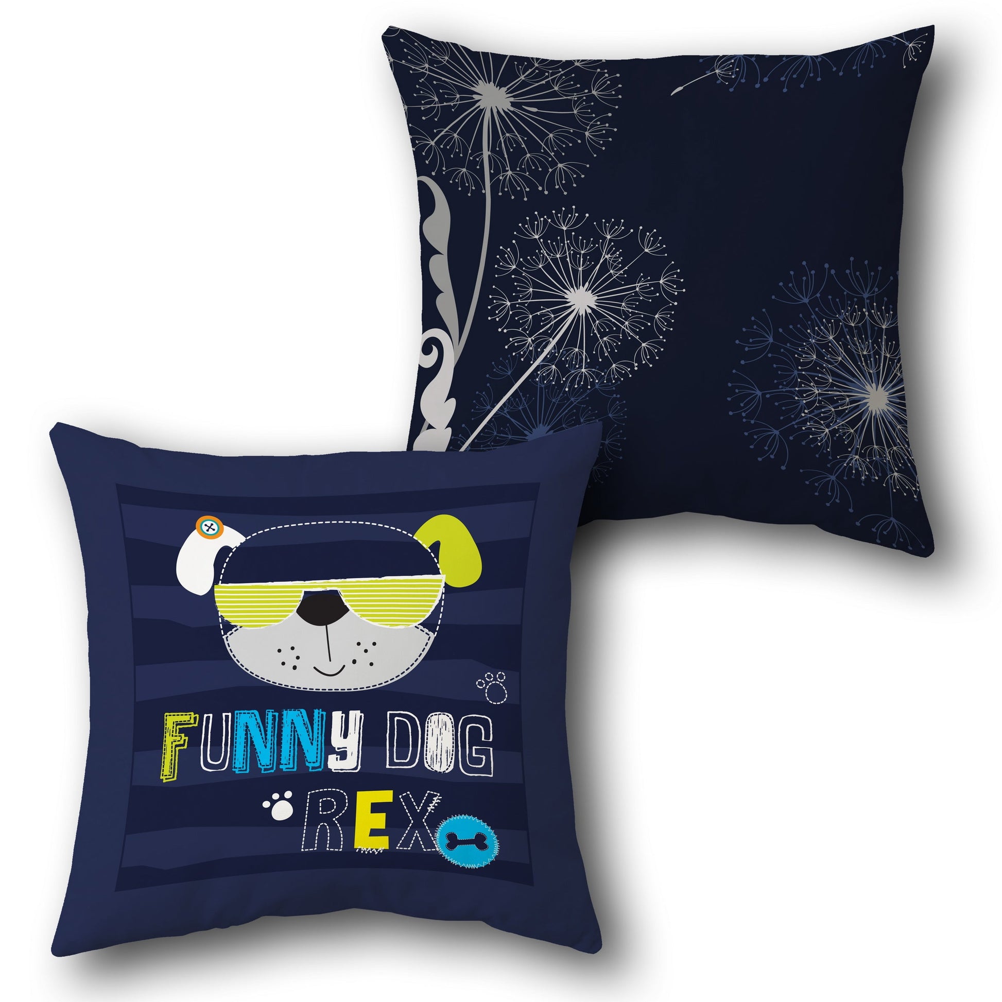 This playful Funny Dog Rex Cushion includes navy blue . One Cushion features a cute dog illustration with sunglasses, a bone, and the text "FUNNY DOG REX" in colorful lettering, against a striped background. The other Cushion is decorated with a delicate dandelion pattern in white and light blue, adding a soft contrast. These are perfect for adding a fun and whimsical touch to any space, ideal for pet lovers or as a quirky accent piece in a living room or bedroom.