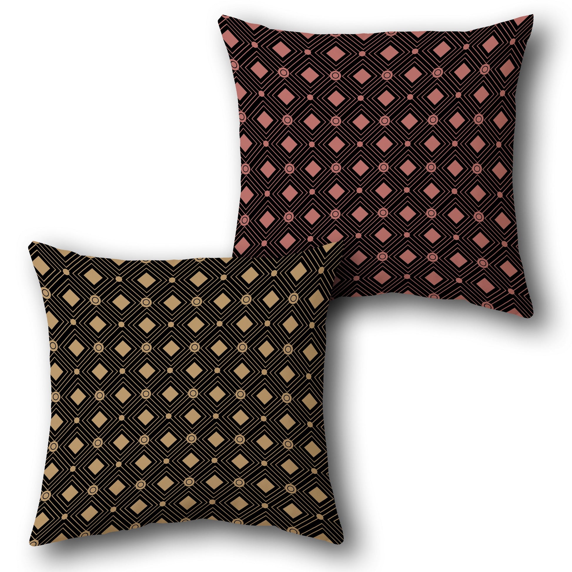 Enhance your decor with this of black throw Cushions, each featuring a striking geometric diamond pattern. One Cushion showcases the design in soft pink and white, while the other displays the same pattern in elegant gold and white, against a solid black background. These Cushions offer a modern yet timeless look, perfect for adding a touch of sophistication to a living room, bedroom, or office space with a chic, contemporary vibe.