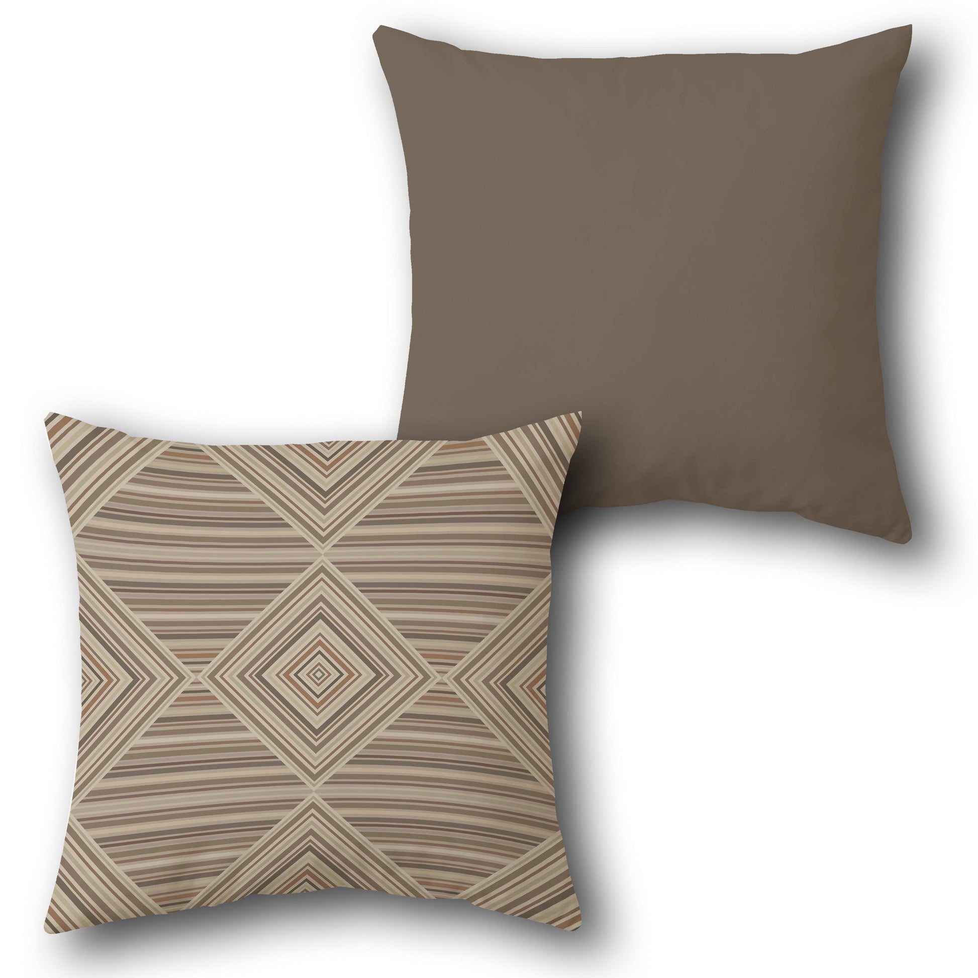 This cushion features a beige base color on the front with a geometric diamond pattern of intersecting stripes in shades of brown, tan, and taupe, creating a modern and sophisticated look. The back is a solid taupe, providing a neutral and cohesive contrast.