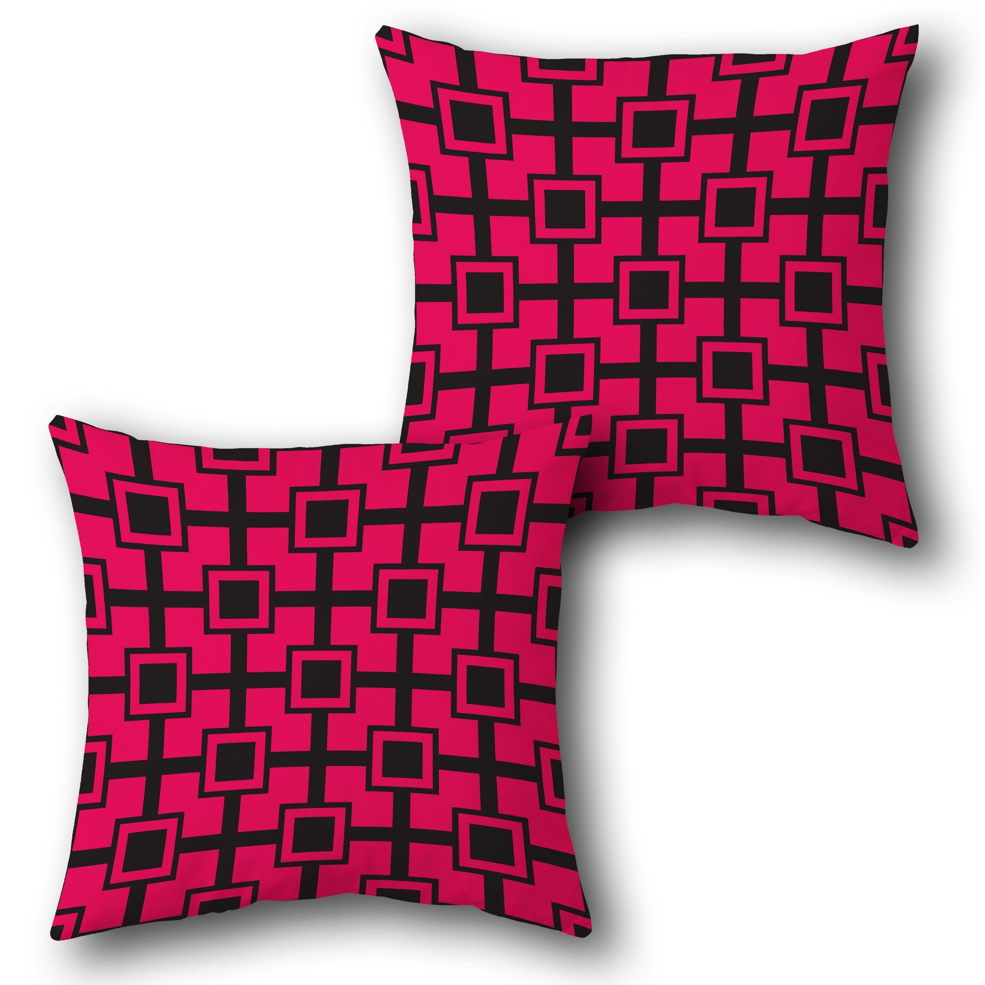 This vibrant Cushion design features a bold geometric pattern of nested black squares interconnected by thick lines, against a vivid magenta pink base. The striking contrast between the rich pink background and the crisp black shapes creates a modern, eye-catching aesthetic, perfect for adding a pop of color and contemporary flair to any room.