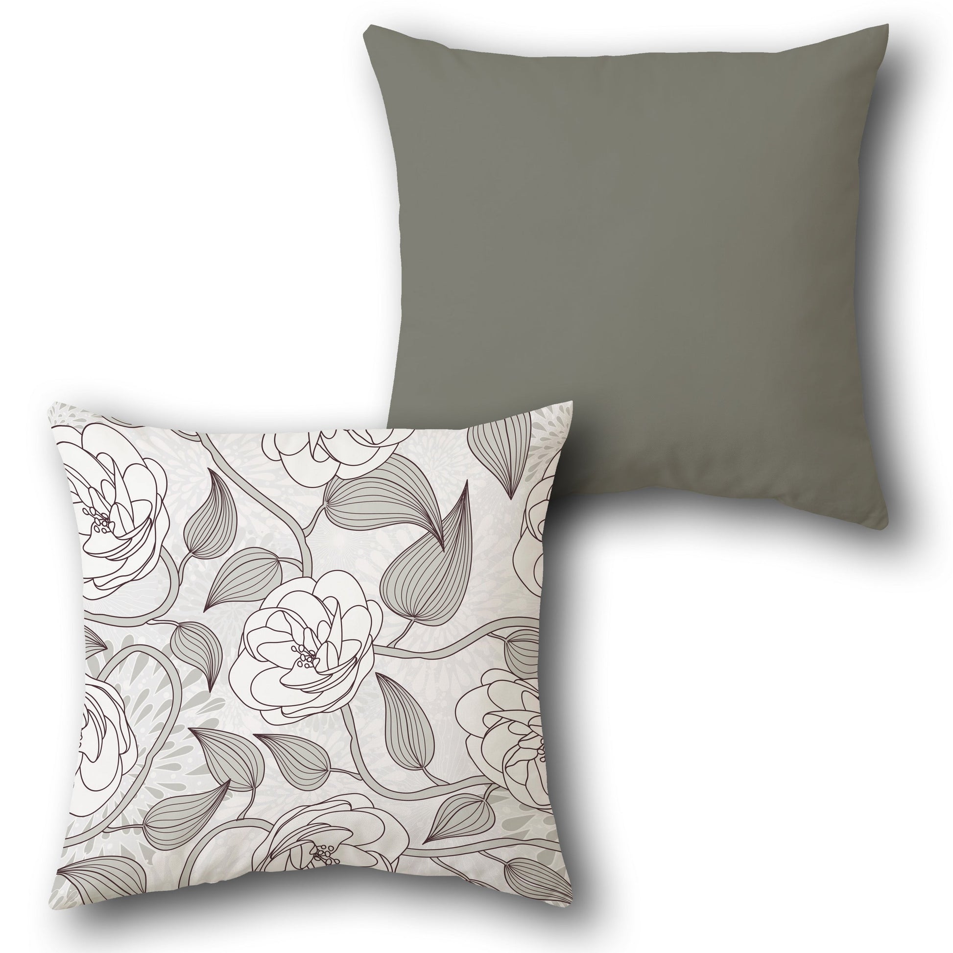 A taupe Cushion with a detailed floral pattern on one side, featuring intricate flowers and leaves in shades of white, grey, and taupe, and a solid taupe color on the other side. The elegant greyscale design creates a sophisticated and timeless aesthetic, perfect for a modern decor. The base color of the design is white with grey and taupe