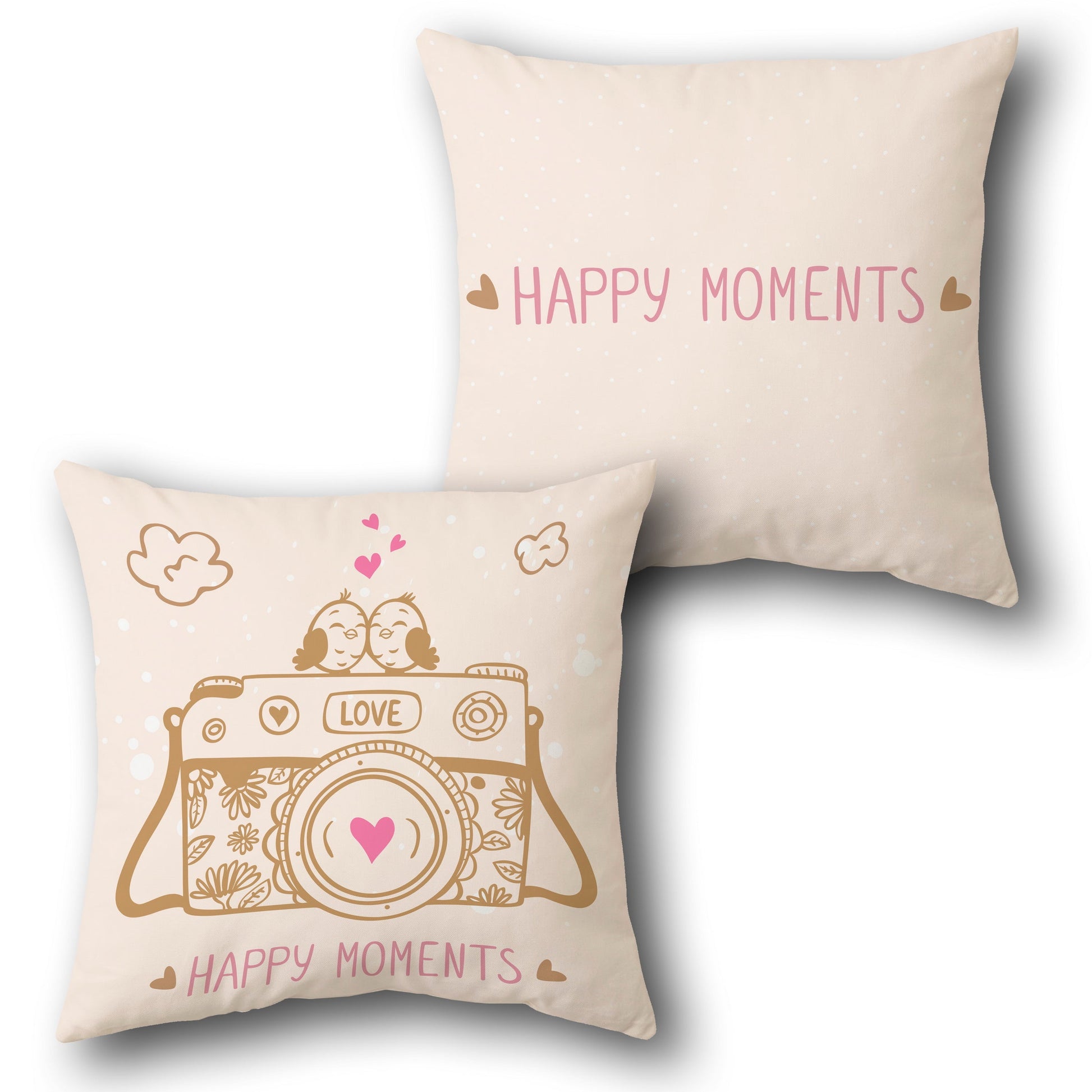 This romantic cushion features a "Happy Moments" design on the front with two birds kissing on a camera in sona (gold) and gulabi (pink) accents, while the back has the text "Happy Moments" in gulabi (pink). The base color is a soft cream (safed), ideal for a loving, nostalgic vibe.