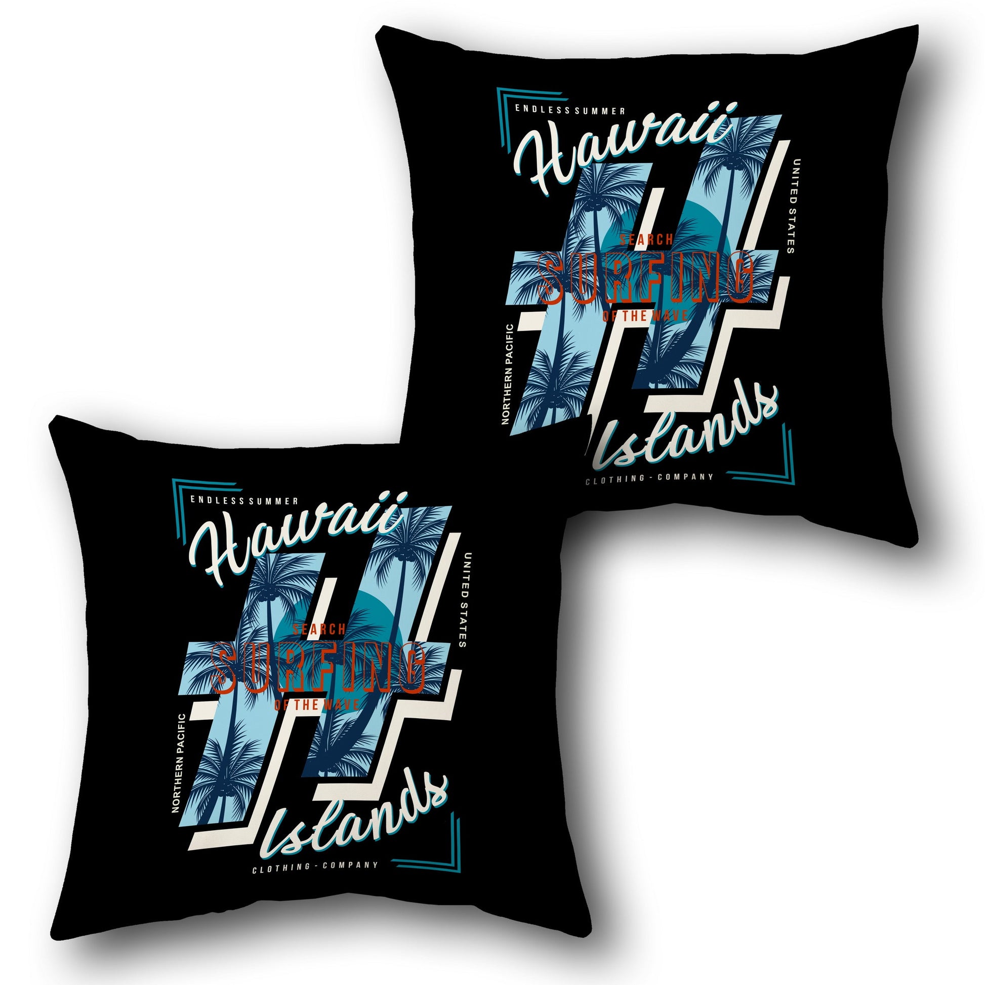 This Hawaii Surfing Cushion brings the spirit of the islands with two bold throw Cushions. Each Cushion features a black base with a vibrant design of palm trees and the text "HAWAII SURFING" in blue and red, accented by phrases like "ENDLESS SUMMER," "SEARCH OF THE WAVE," and "NORTHERN PACIFIC ISLANDS" in blue and white. The design captures the essence of a tropical surfing adventure, making this perfect for adding a coastal vibe to your living room, bedroom, or patio.