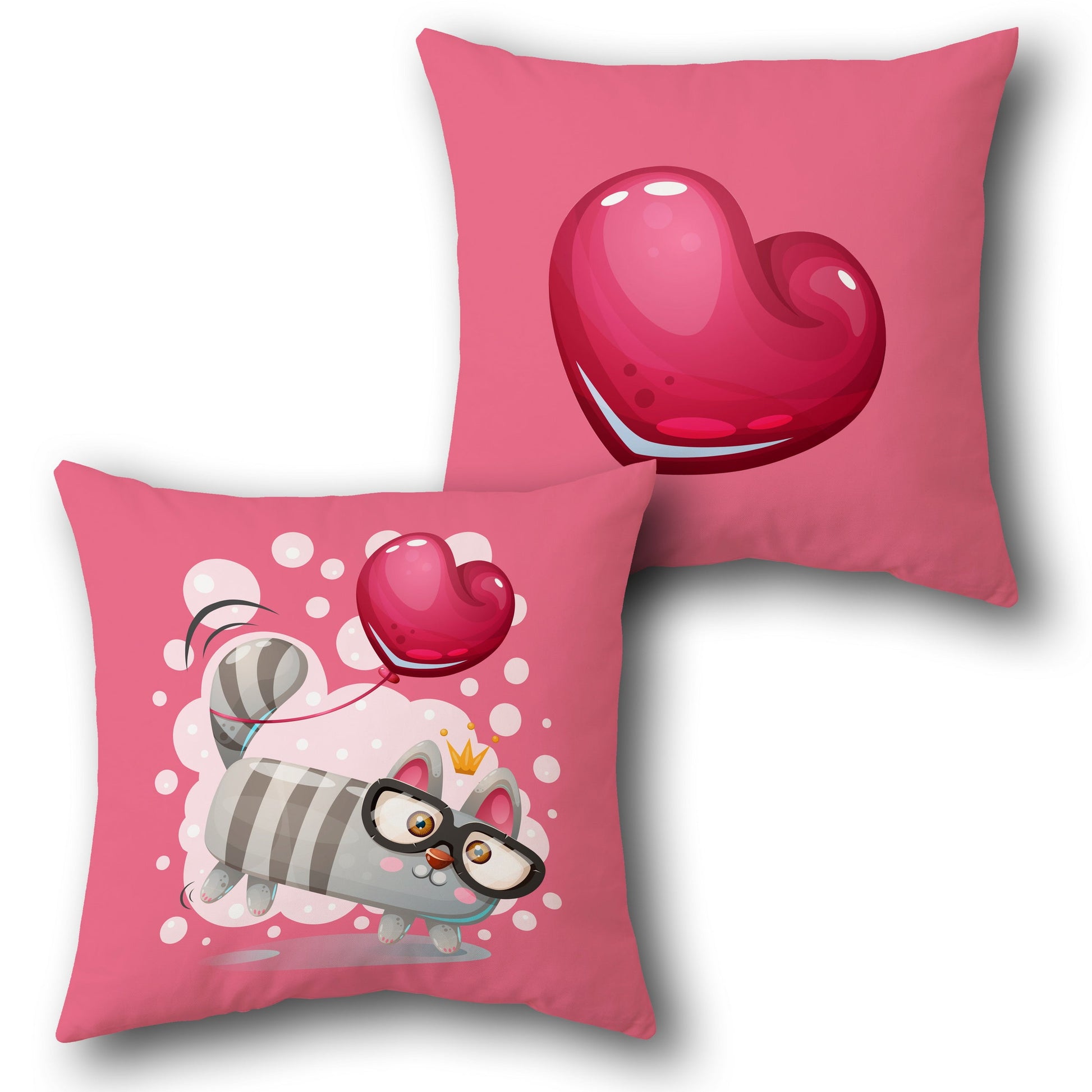 This of two Cushions features a charming cat theme. The first Cushion showcases a gray striped cat with a gold crown, wearing black glasses, holding a pink heart-shaped balloon, and surrounded by white dots. The second Cushion displays a large pink heart. Cushions have a bright pink base color, creating a cute and affectionate design.