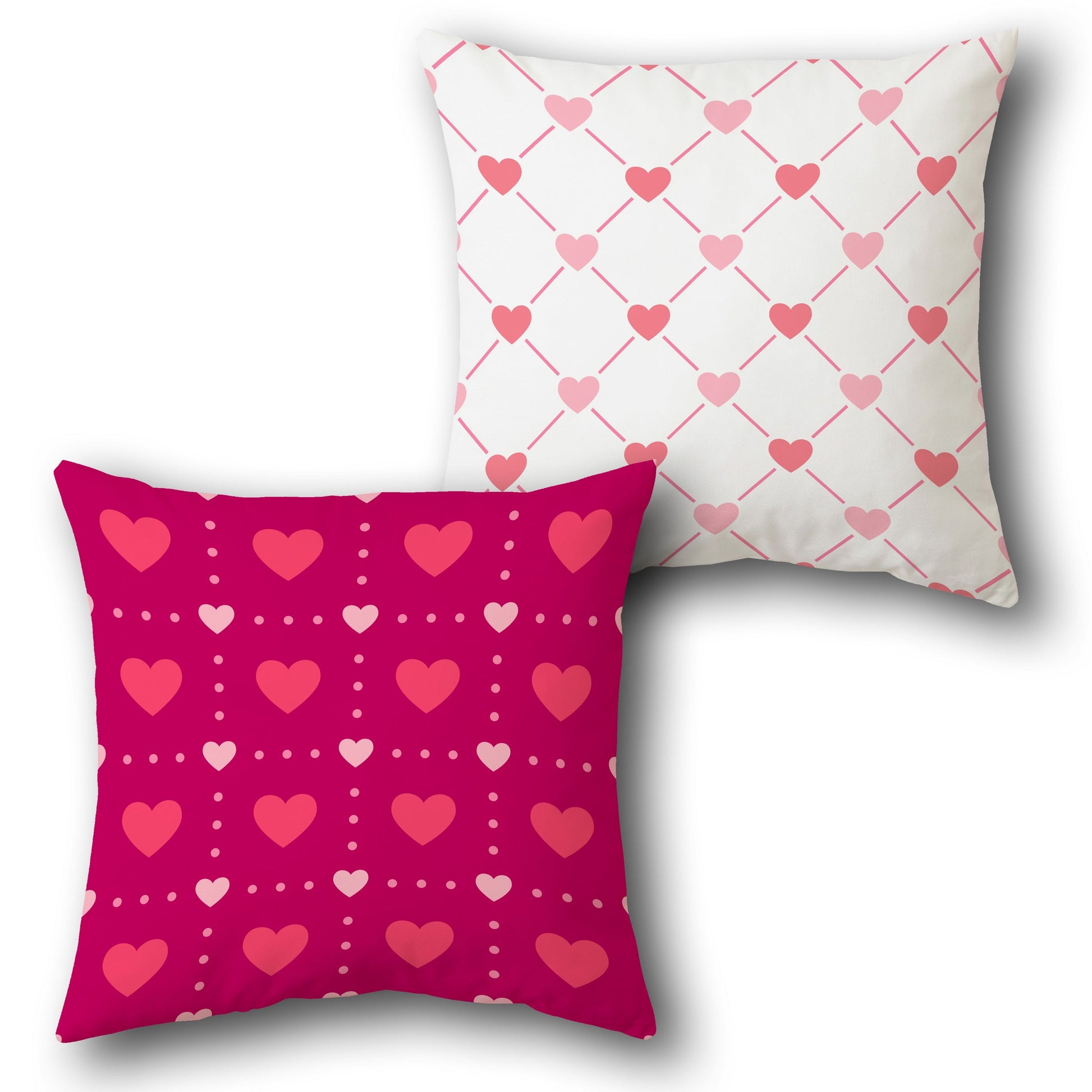 Celebrate love and warmth with this stylish Heart Grid Pattern Cushion Design . Featuring coordinated designs, this is ideal for romantic, festive, or modern interiors. One Cushion showcases a bold magenta base with a pattern of vibrant pink hearts arranged in vertical and horizontal grids, accented by soft dot lines. The second Cushion features a crisp white background with a diamond lattice pattern made of soft pink hearts and connecting lines, creating a clean yet affectionate aesthetic. Perfect for Valentine's Day decor, romantic gifts, or simply adding a touch of love to your living space.