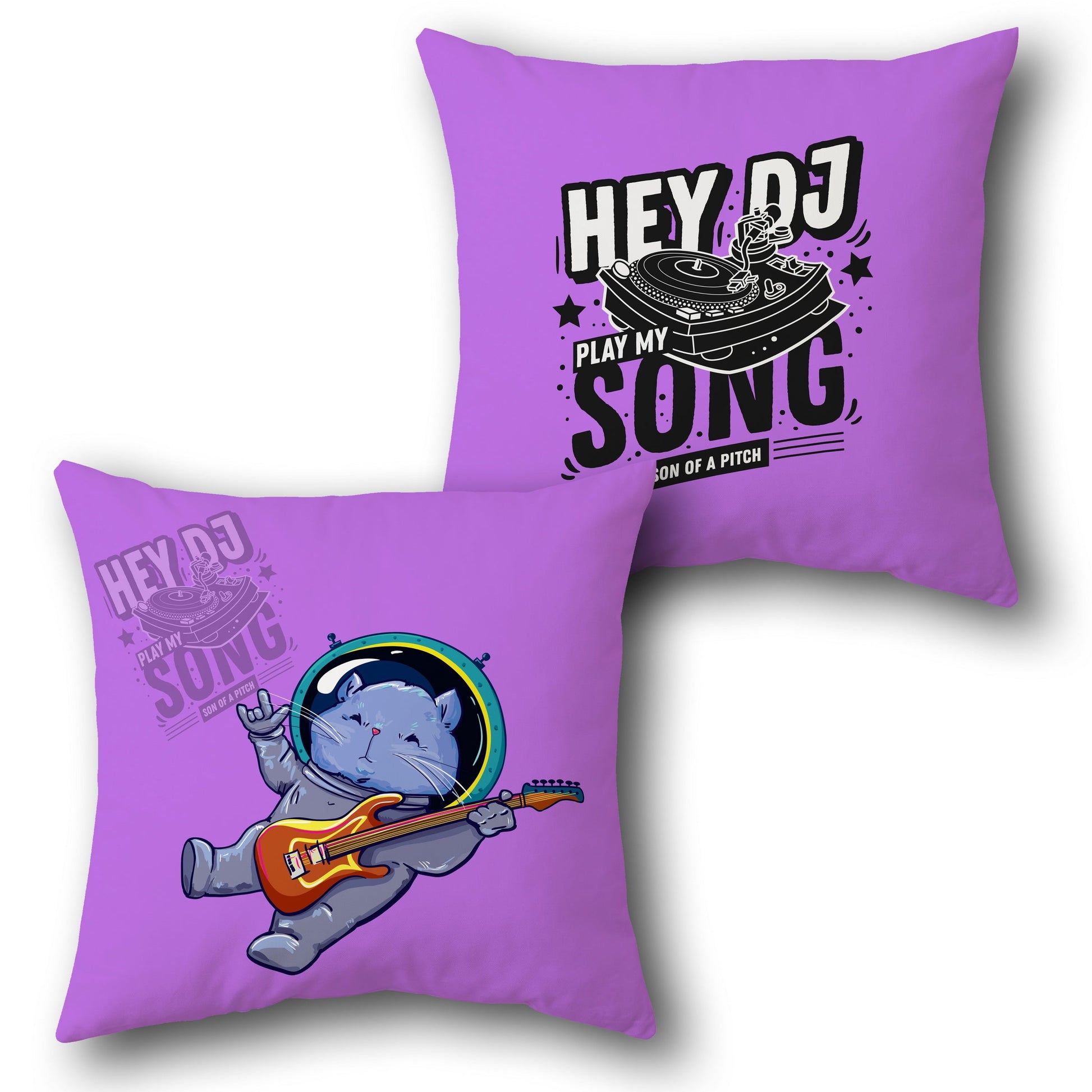 A square, vibrant purple Cushion with a playful music theme. One side features a cute gray cat in an astronaut suit, rocking out with a rainbow-colored guitar, adding a cosmic vibe. The other side has the bold text "HEY DJ PLAY MY SONG SON OF A PITCH" in black and white with star and turntable graphics, perfect for music lovers. A fun addition to any music enthusiast's space.