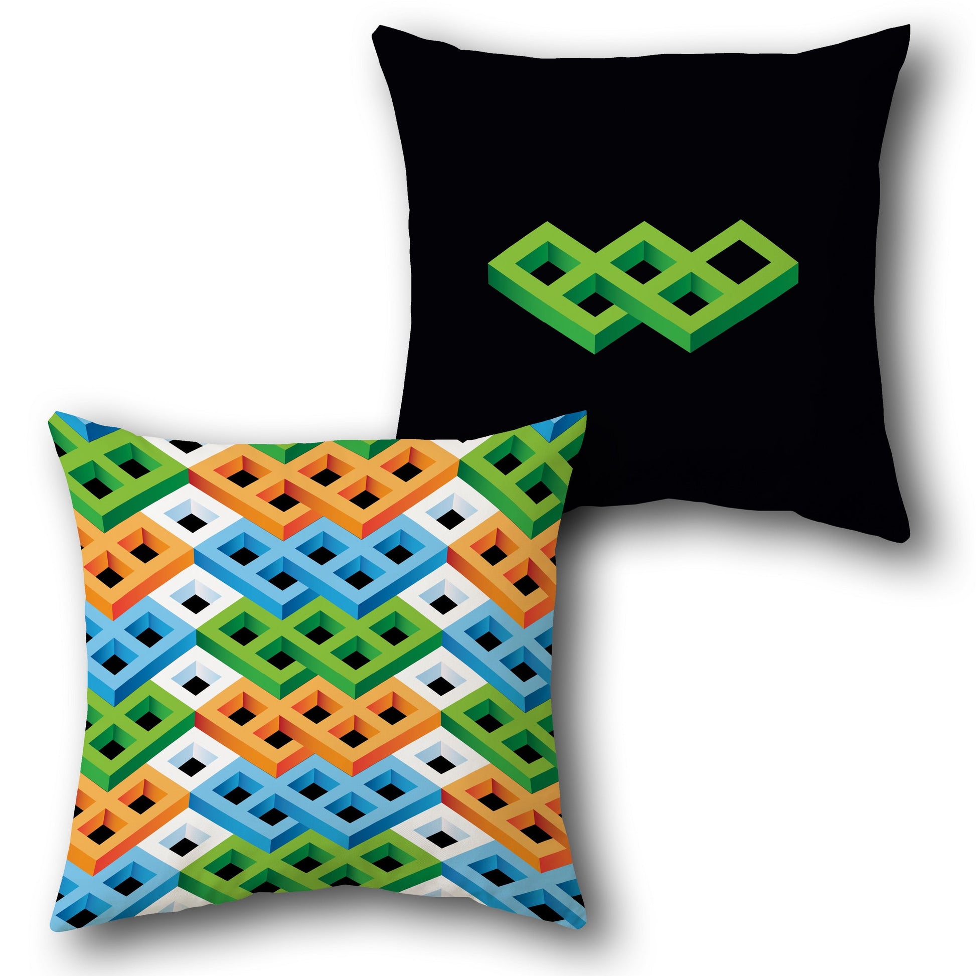 A two square throw Cushions with a mind-bending design. The top Cushion features a single green impossible cube on a black background, while the bottom Cushion displays a repeating pattern of impossible cubes in green, orange, blue, and white, creating a bold and intriguing accent.