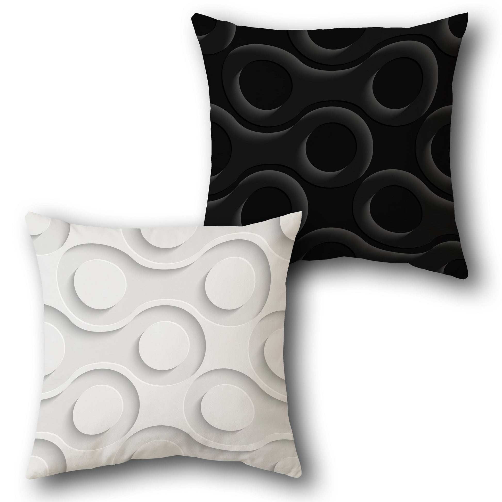 This cushion features a front side with a white base color and an embossed infinity circle pattern, where overlapping circles create a continuous, flowing design with a 3D effect. The back side has a black base color with the same infinity circle emboss pattern, providing a bold contrast while maintaining the modern, abstract aesthetic.