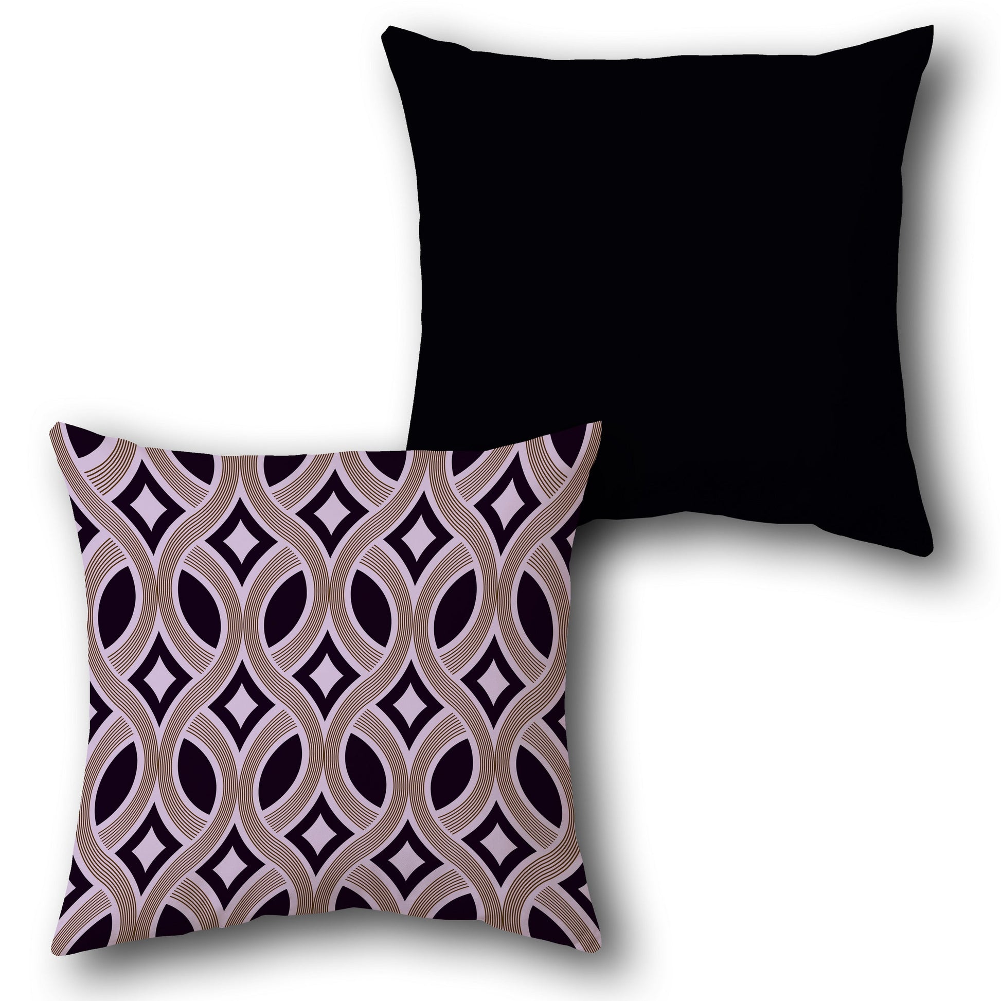 This cushion features a front side with a purple base color and an interlock wave pattern in shades of black and beige, creating a dynamic, woven effect with diamond shapes. The back side has a solid black base color, offering a sleek and minimalist contrast to the intricate front design.